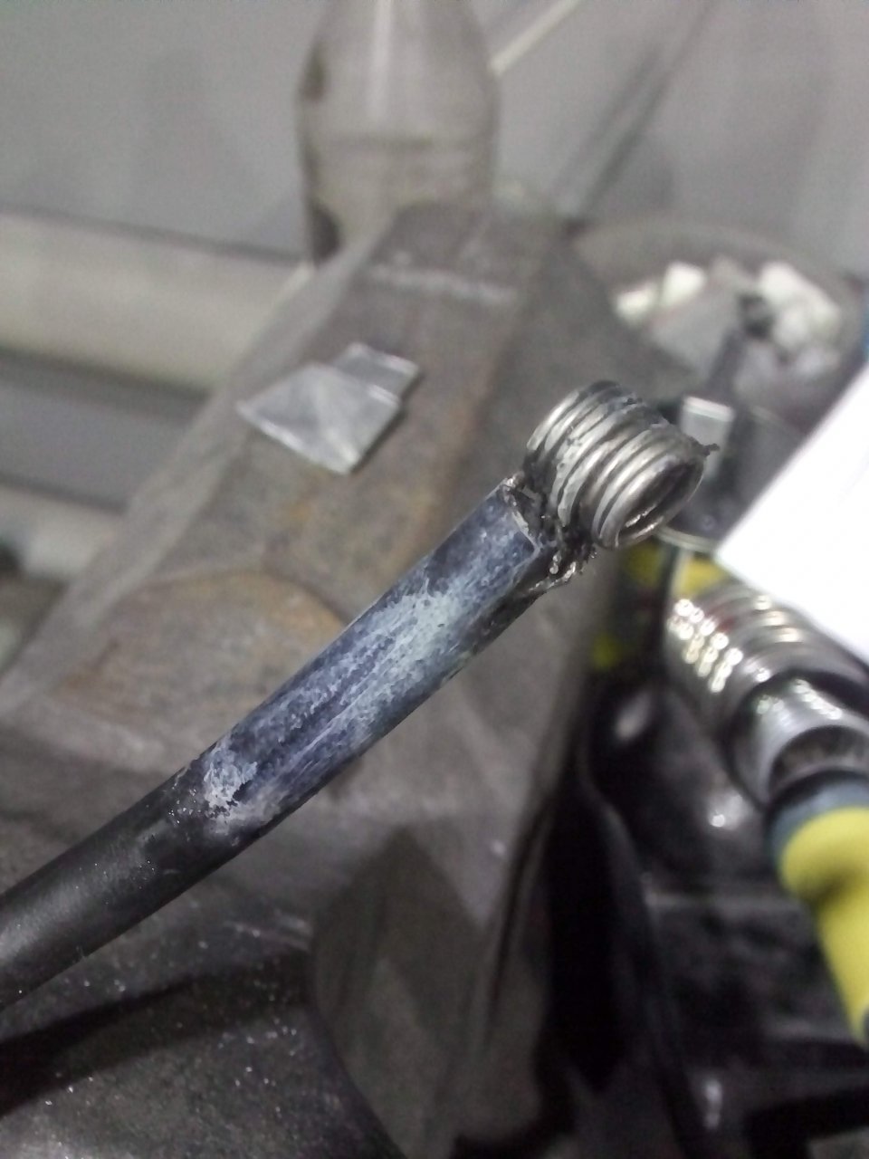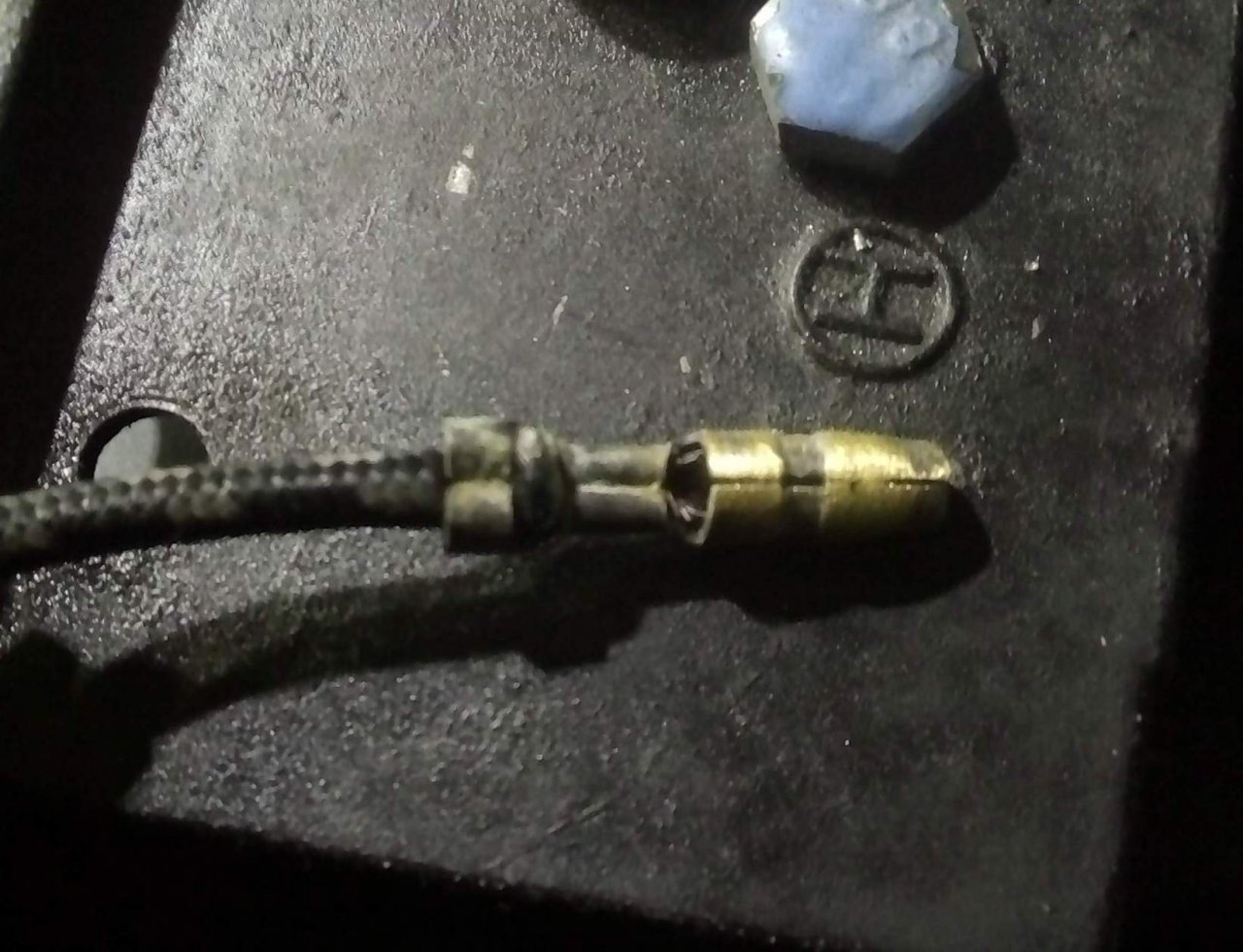 При попытке развальцевать "маму" провода первого цилиндра, сломал её. Пришлось соединять кабель с другой "мамой". Сами медные жилы кабеля первого цилиндра при зачистке изоляции имели чёрный налёт, но контакт был хороший. Куски провода паять нельзя, обязательно обломятся, поэтому использую обжимку. Откусываю часть клеммы.