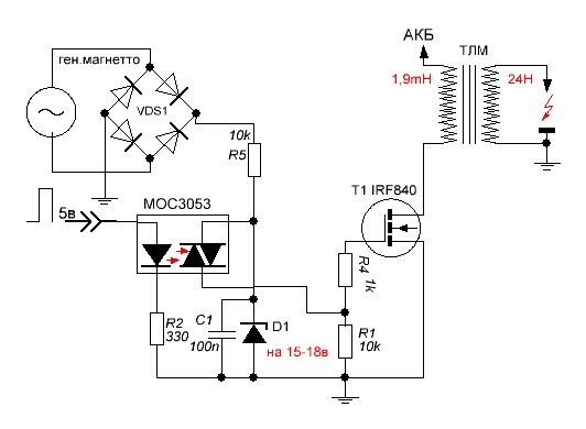 Вот те которые я проверял. Подключение стоковой катушки с авто трансформаторной связью.Недостаток моего ТЛМ- малая входная индуктивность.От этого зависит энергия искры.В живую не проверял,нет всех компонентов.В схеме надо установить диод 4007й на входную обмотку ТЛМ минусом к АКБ.Вот уже исправил.ВВ напряжение необходимо для надежного отпирания полевика