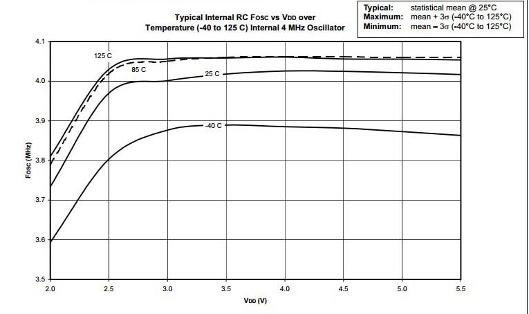 График красивый с дрейфом всего в 1 %, но если задуматься, то на графике есть температура -40 и +125, что соответствует даже не индустриальной версии контроллера, а скорее милитари. Коммерческая версия гарантированно работает либо 0+85, либо -25+85. Собственными глазами видел на контроллерах коммерческой серии дрейф почти под 10% при питании 3,3 Вольта.