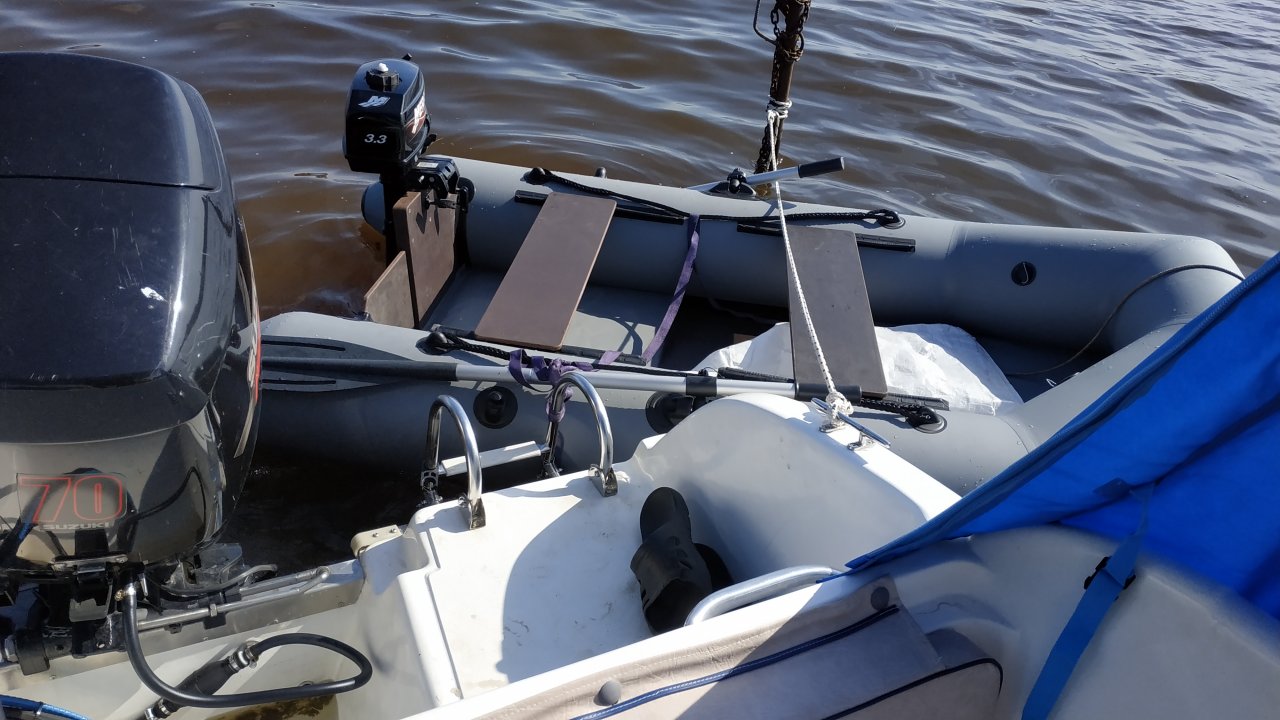 Ездил на прошлой неделе по заливу, прошел всю Неву, встал на ночлег возле Орешка. Всё время находился на борту. Приготовил ужин, переночевал. Спать в каюте очень комфортно. Утром испытал шлюпку. Лодку легко надул на борту (на электронасосе). Прошелся по Ладоге. Шлюпка Тулин 240 очень легкая, мотор поставил от докатки Меркури 3.3. На полном газу чуть не перевернулся. Поднял на борт одной рукой, также легко сдул и собрал лодчёнку. Думаю, в следующем сезоне постаить якорную лебедку. Можно будет встать на якорь и высаживаться на дикий берег на шлюпке. На следующий день прошелся по обратному пути до яхт клуба на заливе. Прошел 200 км, сжег 80 литров бензина (Сузуки 70). Разгонял лодку до 52 км ч, в основном шел на крейсерской скорости 36- 38 км ч. Порадовал ходовой тент. Можно сделать его типа бимини, а можно полностью закрыться. Биотуалет оказался очень непрактичным (зря покупал). Занимает пол каюты, и кто там будет оправляться, изрыкая миазмы?! По малому спасает любая баночка, если не хотим испачкать борт при качке, а женщинам подойдет детский горшок, и содержимое в воду. А по большим делам можно раз выйти на берег.