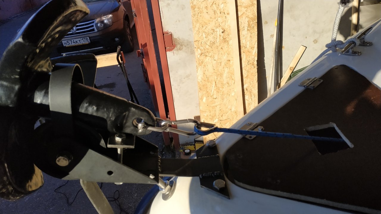 Поставил лебедку Си про 45 в якорный ящик. Пришлось снять наружный корпус. Хоть он и влазил в якорный ящик, манипулировать и что - либо сделать было невозможно. Закрепить лебедку в ящике пришлось за заднюю стенку каюты и стянуть со стороны каюты болтами., а спереди зацепить за внутрение болты крепления рыма. Все крепления сделал из стандартных уголов и пластин. Установить роульс также было проблематично. Напрямую поставить невозможно, очень мало места, к тому же сильный наклон поверхности. Купил железную полосу 4 на 40 мм, и сколхозил вот такую штуку. Дырявить оригинальную крышку якорного отсека рука не поднялась. Вырезал из бакелитовой фанеры другую крышку. Позже покрою её китайским тиком.