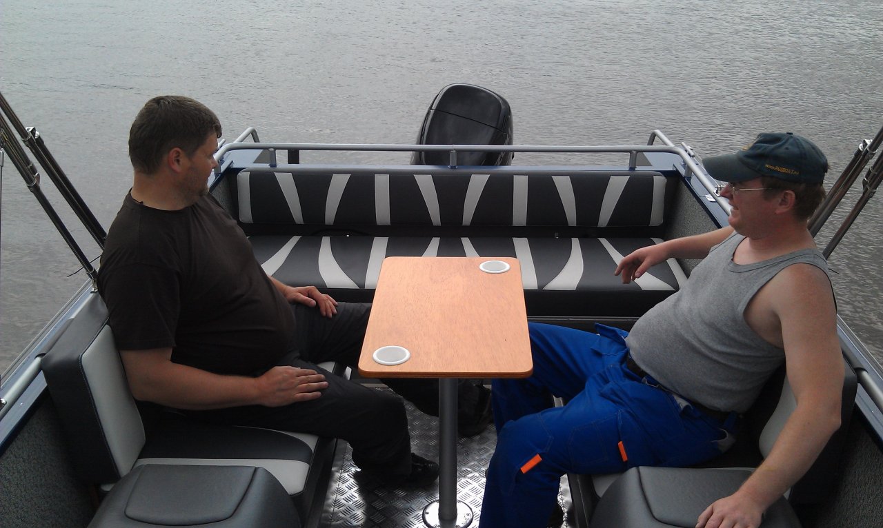 Заказывал индивидуальный проект катера с использованием для рыбалки и автономных походов на 3-4 дня компанией из 4-6 человек. Материал АМГ. Длина корпуса катера 6,0 метра, с кринолинами будет 6,4 метра. Двигатель Suzuki DF140, год выпуска мотора 2011 катера 2012. Огромное количество мест для долговременного хранения походных вещей. Возможность трансформации задних рундуков в полноценное спальное место для 3-х человек. Отличные американские морские кресла Atwood (редкость на наших катерах). Возможность установки одного из них на нос катера для комфортной ловли спиннингом. Возможность установки обеденного столика в корме катера. Высокий тент позволяет стоять внутри его в полный рост человеку ростом 185 см. Дополнительная платформа для купания позволяет не только удобно обслуживать двигатель но и комфортно ловить рыбу. Наличие стационарной лестницы на ней позволяет купальщику легко попасть обратно на борт. Словом удачный проект который сочетает в себе надежность, комфорт для большой компании, и отличные мореходные качества (проверено на деле!). Оптимальный по весу и самый экономичный подвесной мотор в своём классе, позволяет разгонятся до 70 км/ч, крейсерский ход 55-58 км/ч.