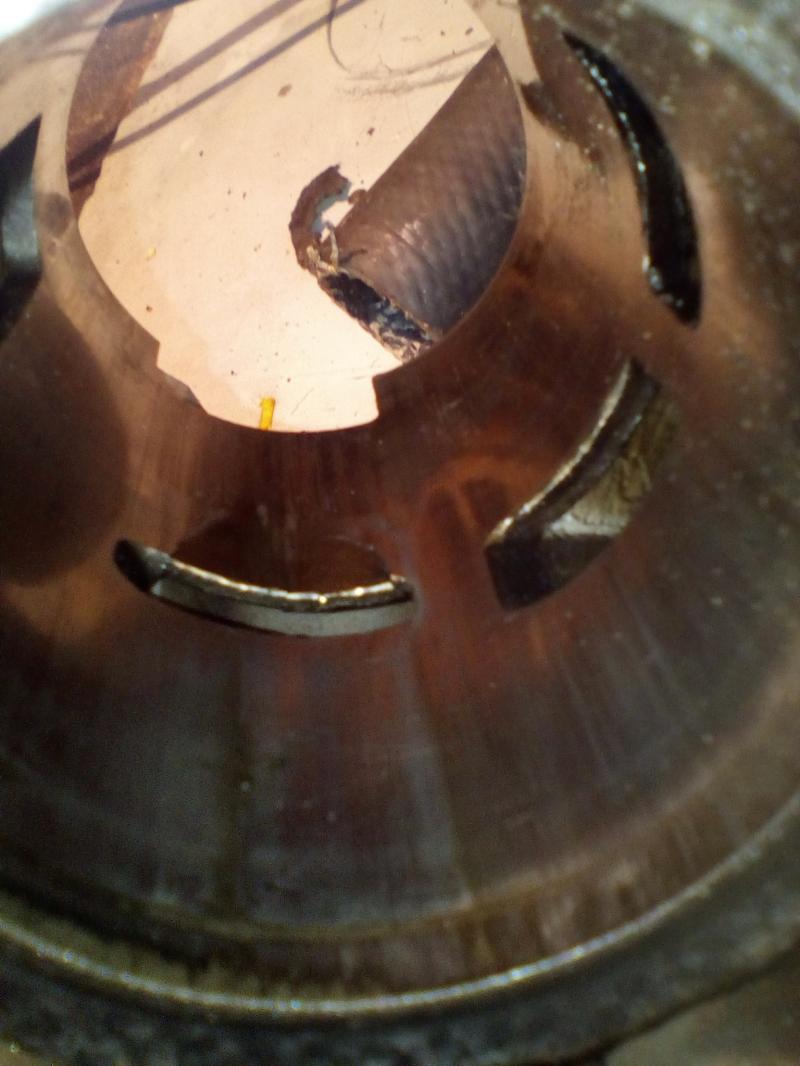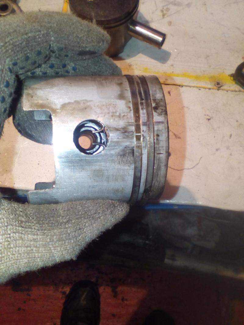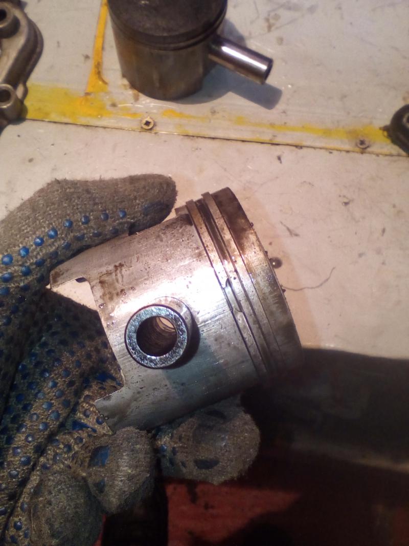 Как виндно поршневая имеет следы задира со сторон бабашек, на стороне впуска и выпуска таких задиров нет. Гильза верхнего цилиндра повреждена, нижний просто с продольными рисками на зеркале. Еще по мотору, подшипник средней опоры убит в хлам, лабиринт увеличен в диаметре. Картер на вид сухой, плоскость под золотники баллистит как у кота ...