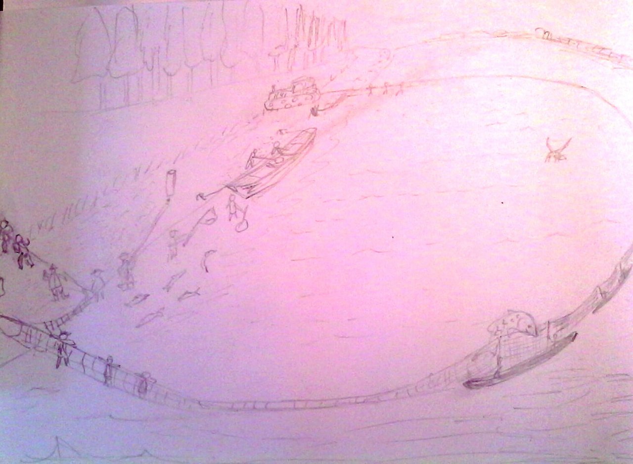 Внутри невода широкими кругами ходила огромная белуга. Двухметровый рыбак бегал с штуковиной похожей на цеп. С колотушкой на жерди. Гигант лупил белугу, а она осматривалась и пыталась перепрыгнуть невод . На 2-3х старинных лодках с шестами дежурили рыбаки и не позволяли ей сбежать. Однажды Рыба почти выскочила, но умелые дежурные смогли столкнуть ее внутрь невод. А Рыба свои попытки выскочить делала совершая круги внутри сужающегося невода, вероятно, набирая скорость для прыжка. И один из ударов зюзьгой (вроде так называли колотушку) оглушил ее. На кукан Рыбу приспособили совсем неуважительно, как ерша! Везли, правда с почетом, буксируя за легким катером. Она (уже не живая) глиссировала на буксире.