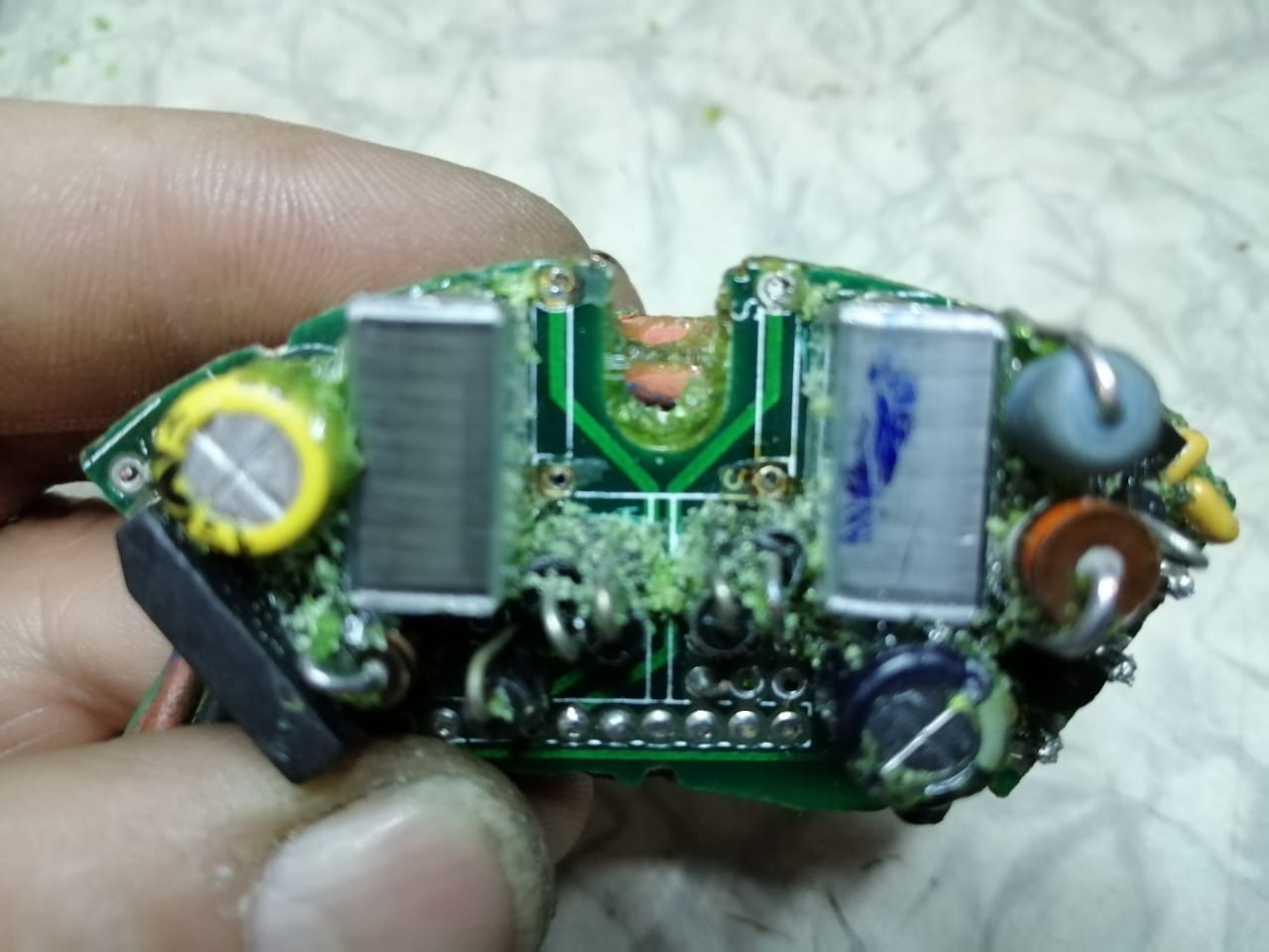 Здравствуйте.Поковырял еще компаунд.Под взорвавшейся деталью нашлось монтажное обозначение -S1.Правым выводом она соединялась с проводом глушилки.Деталь со стороны дорожек,ошибочно принятая мной за накопительный конденсатор,оказалось монтажной сборкой(скорее всего блок ограничения оборотов по термодатчику,т.к. связана с его проводом).Приподняв эту сборку удалось выпаять катушку.Катушка двухсекционная.Ближняя к маховику обмотка намотана проводом 0.13 и имеет меньше витков чем дальняя.Дальняя намотана 0.1.При демонтаже дальнюю пришлось оторвать-монтаж двухсторонний.Витки еще не считал.На последнем фото видно управляющие тиристоры.