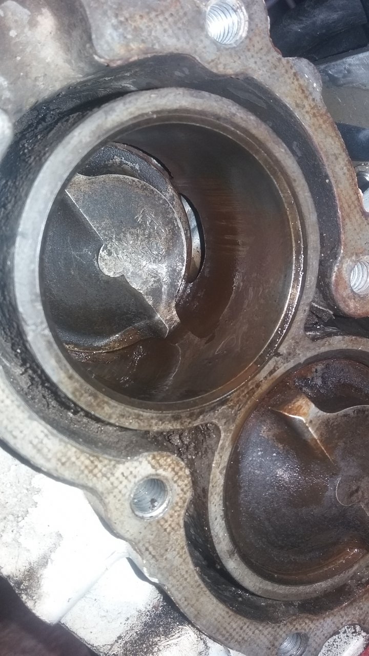 Разборка блока цилиндров ещё впереди, но пока каких-то люфтов в КВ обнаружено не было, надеюсь, подшипники живые.Сетку нагони на цилиндрахСегодня получил заказанный комплект дюймовых ключей (в магазинах города не нашёл) и вскрыли движок. Сняли ГБЦ, - задиров на гильзах обнаружено не было, а вот кольца залегли весьма качественно! ☻ Канал охлаждения около верхнего цилиндра забит напрочь, причём не известковой хренью, а чем-то чёрным и плотным, очень похожим на нагар. Сами же поршни без нагара, всё гуд!Разборка блока цилиндров ещё впереди, но пока каких-то люфтов в КВ обнаружено не было, надеюсь, подшипники живые.