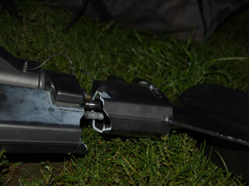 Пока механизм происхождения подклинивания фиксатора непонятен. Вспоминая последние плавания, вроде происходило так - удар на мелководье, движок отбрасывает, потом подклинивает фиксатор... Видимо, прошло 2 удара - на первом подбросило, а второй уже встретил по-полной...