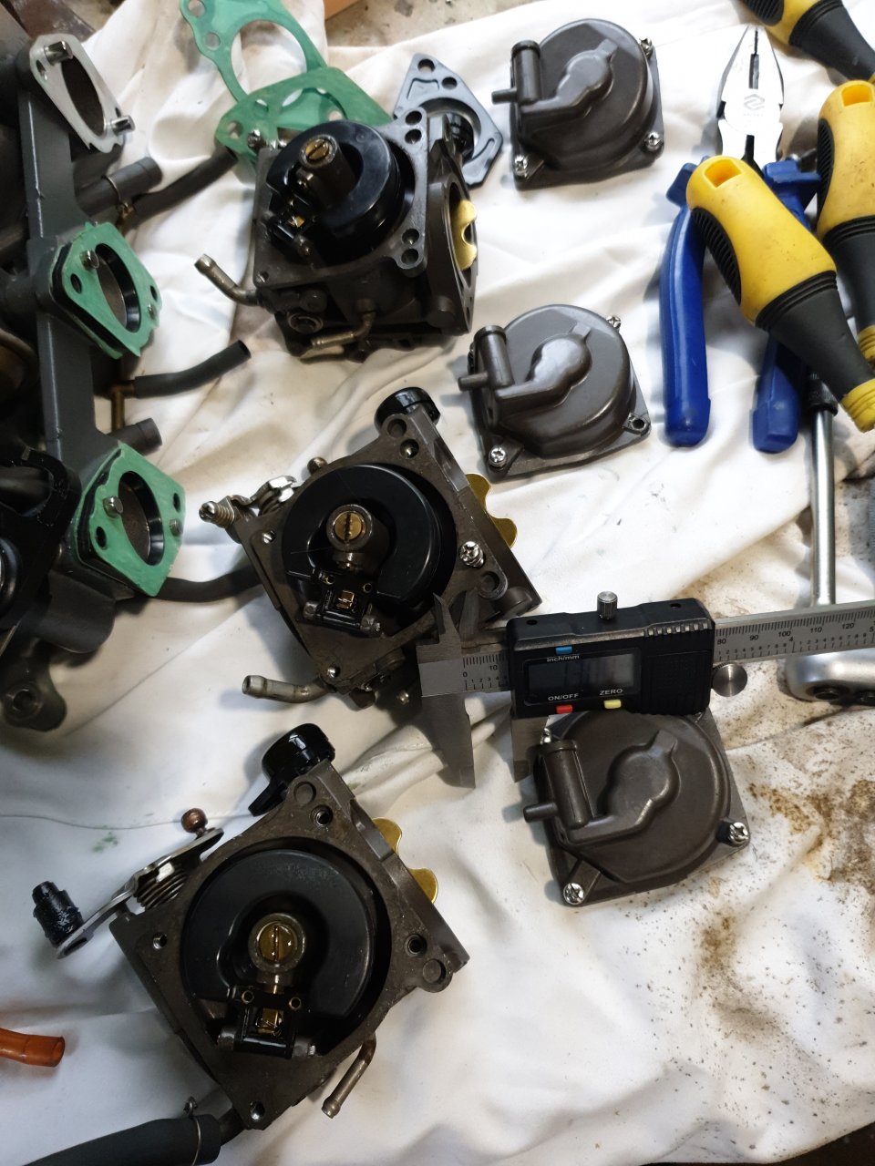 На выходных сниму опять карбюраторы, продую, проверю уровень поплавков и засниму видео без рессивера. На холостых при нажатии на мембрану ускорительного насоса обороты растут, значит они рабочие, да и не влияет это на максимальные обороты. При сборке не увидел гнутых шатунов и провернутого маховика, была-бы шпонка срезана. Сверил, карбюраторы по маркировке от 30-ки 13А[А]. Думаю что топливная система здесь не причём, на нейтрали же не крутит до номинальный оборотоввы рессивер сняли ? при снятом рессивере будет видно в диффузоры карбюраторов что происходит в каждом из них. работают ли ускорительные насосы. Метки ГРМ, проверьте еще раз вывернув свечу первого цилиндра и установив его в ВМТ, а не просто по меткам. Там может шатун гнутый, или проворот маховика.