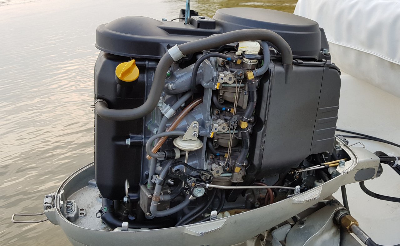 Мотор Honda BF50 2007 года выпуска, четырехтактный, трехцилиндровый, карбюратор.