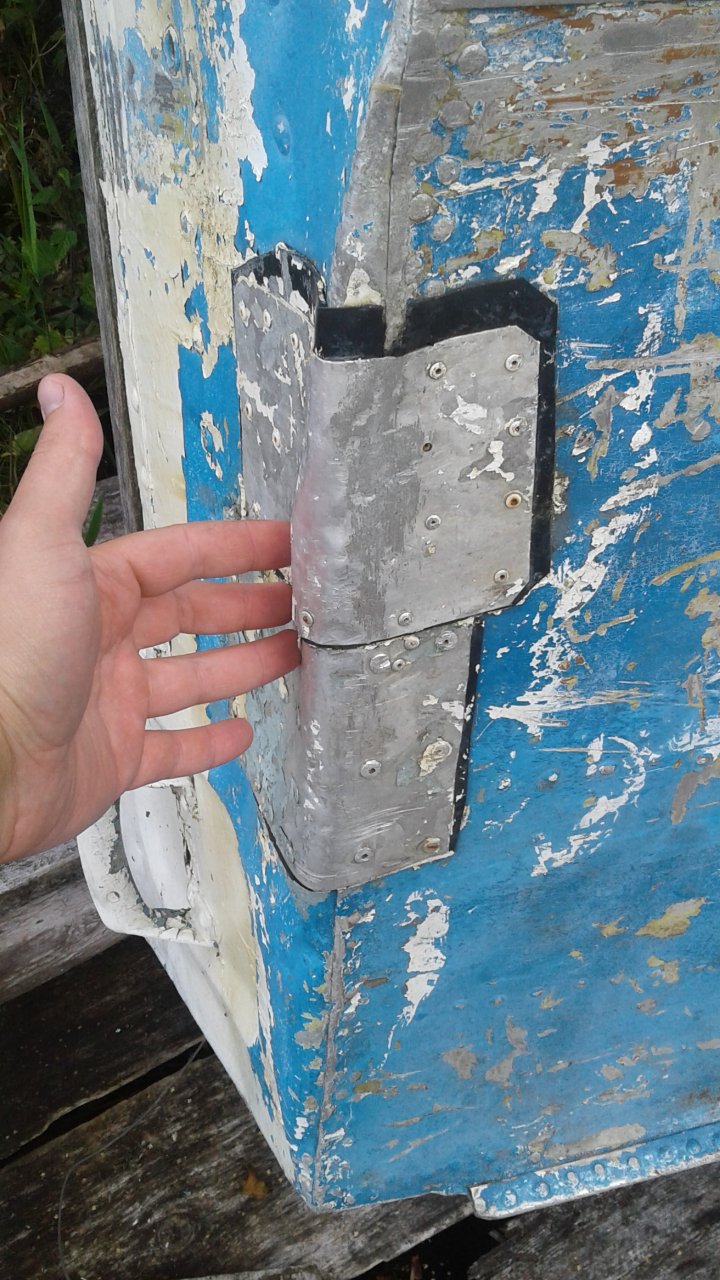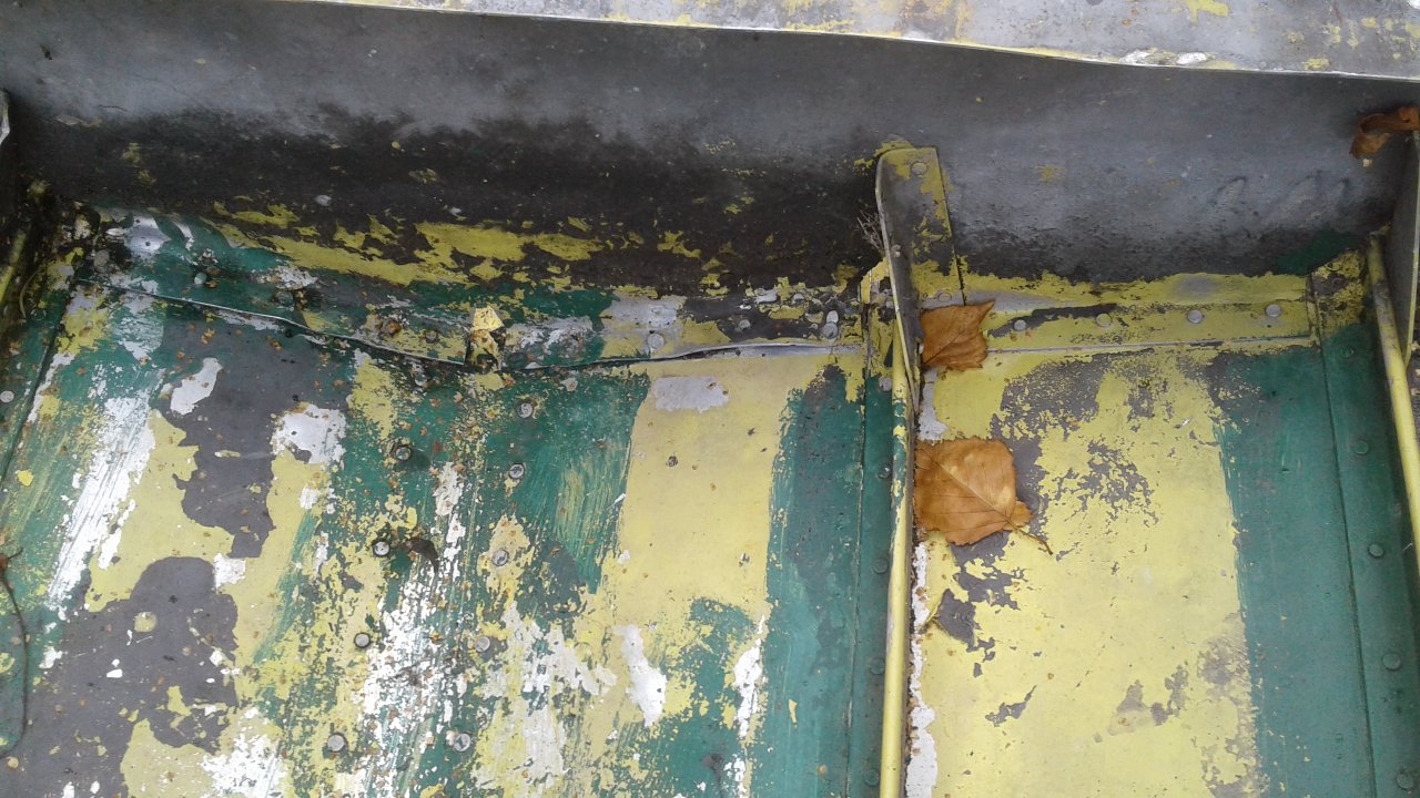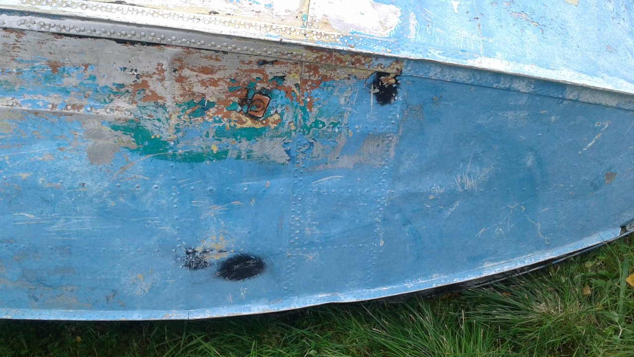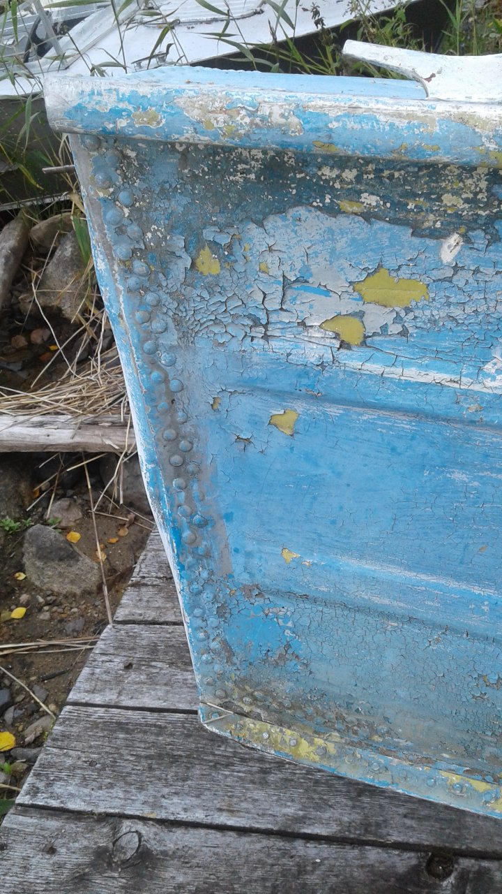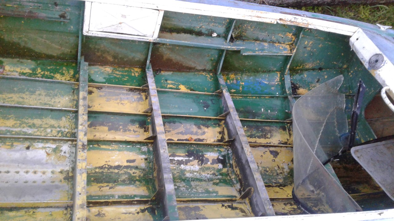 В транце, на стыке залатаны трещины, на днище есть сильные потертости о камни(2 шт.), заклепок 18 стерто.