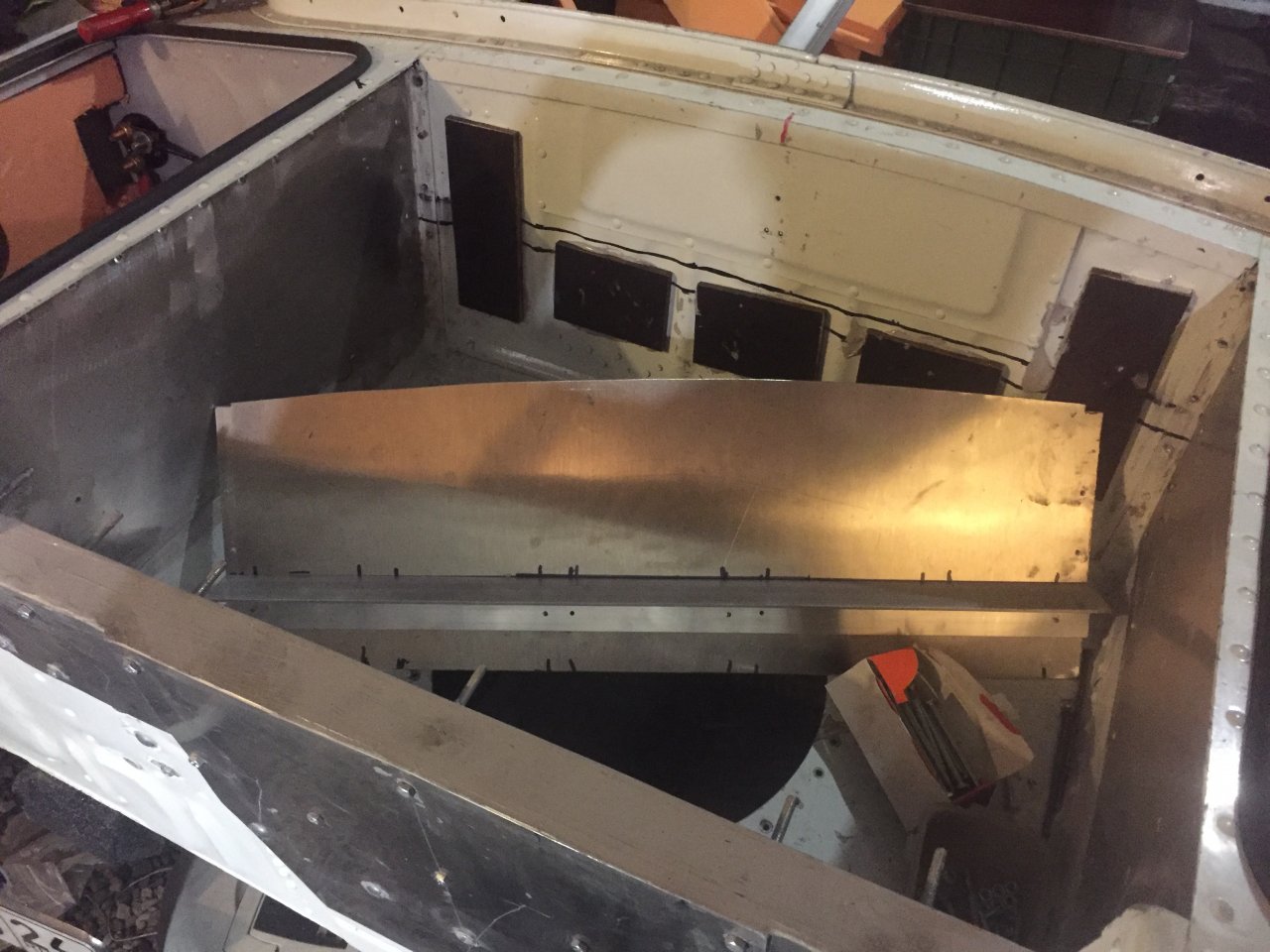 Вот что успел за пару часов. Стенку рецесса выровнял накладками из фанеры, нужной толщины . К листу алюминия приклепаю уголок который будет дополнительно притянут болтами через стенку переборки к швеллеру. По контуру накладной лист клепается заклепками.