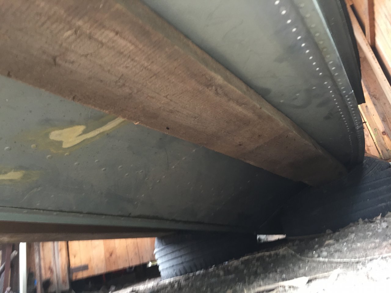 Сегодня осмотрел лодку с водой на протечность! По скулам все сухо, трюм тоже сухой , по днищу все внорме, кроме киля , ближе к середине немного потеет около кромки киля , но капель нигде нет. Так же проклепали швелер в усилитель задней переборки. привязали его к полочкам по бортам. С килем думаю пройтись еще раз молоточком.