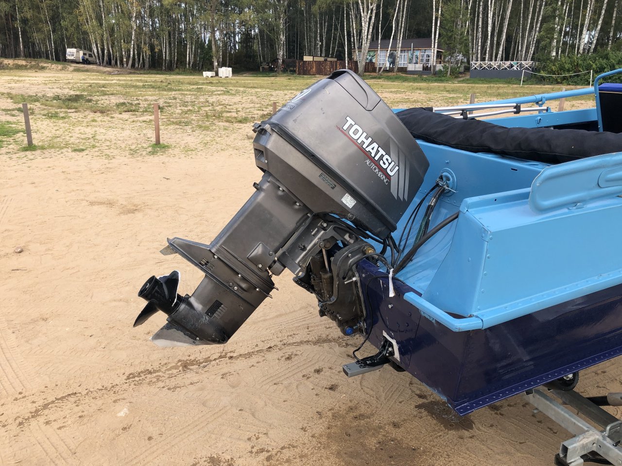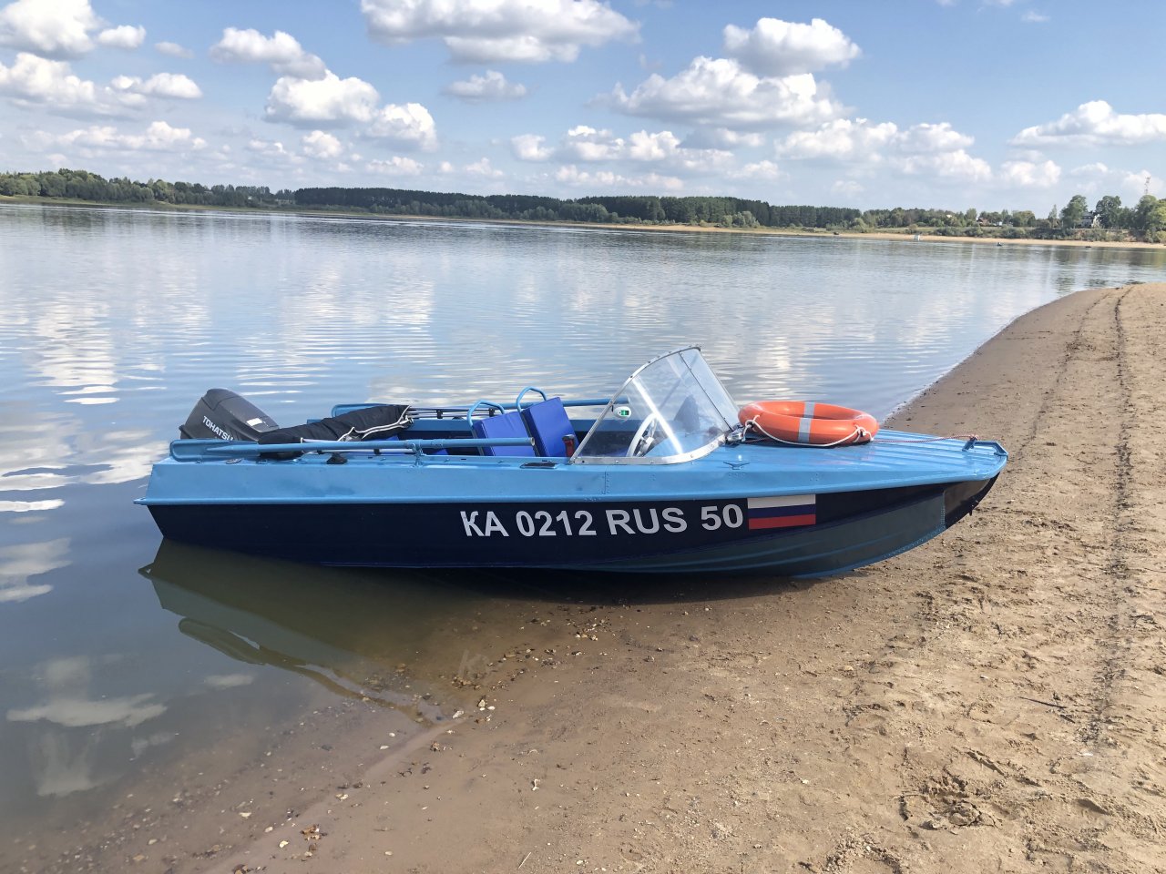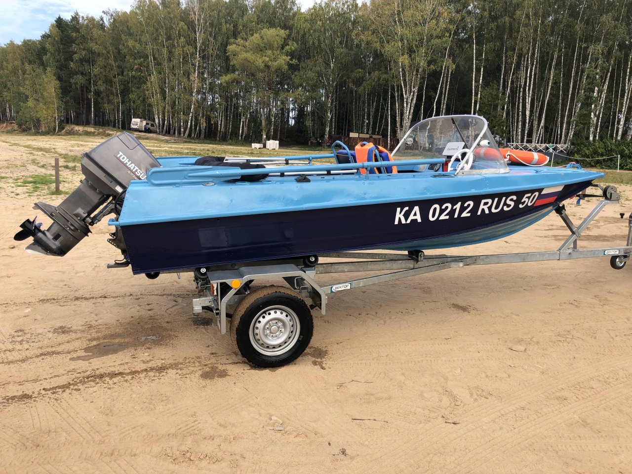 Комплект в идеальном состоянии: Казанка 5м4, лодочный мотор Tohatsu 50 EPTOS с тримом и гидроподъемом, два тента(ходовой и транспортировочный), прицеп Вектор ЛАВ с роликами.