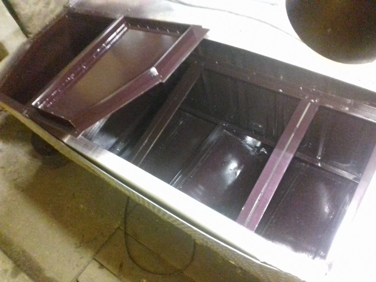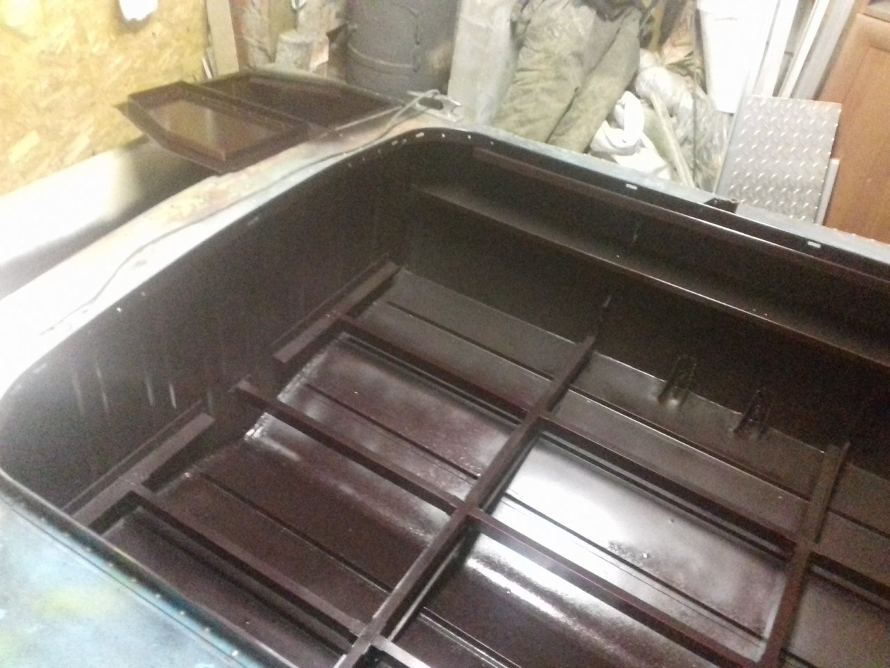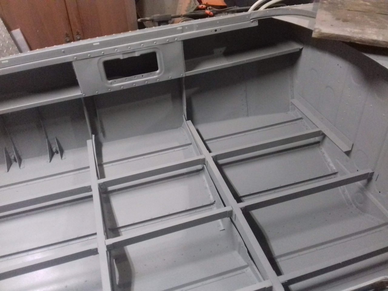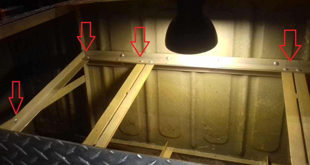 Будет еще две шпильки из нержавейки с профильной трубой! С внутренней сторозы переборки, так что жёскости вполне!Что-бы сделать жёсткое соединение, надо создать механическое напряжение между деталями. В данном случае вместо заклёпок в горизонтальном тавре надо было временно поставить винты с гайками, с другой стороны переборки то-же поставить тавр или уголок, что-бы переборка меньше изгибалась. Потом всё это стянуть винтами, и только потом заменить винты на заклёпки.