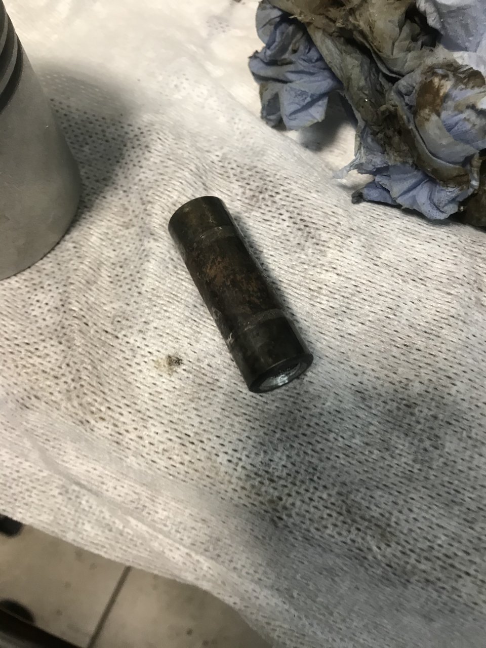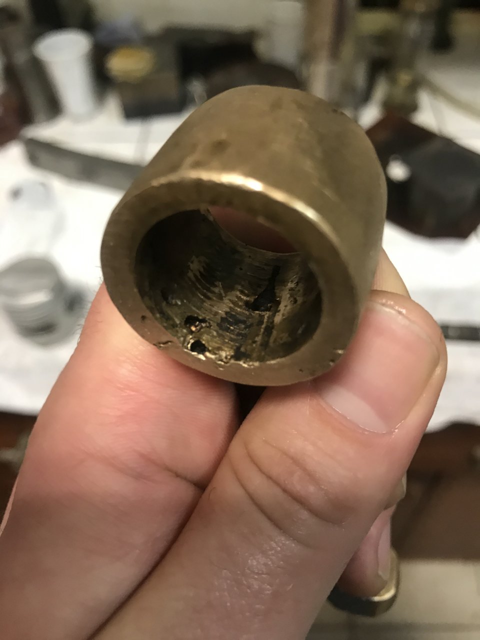 А теперь нужен совет! Один шатун прекрасно себя чувствует, ходит на пальце без люфтов и легко. Его я даже трогать не буду, а вот второй провернулся на втулке, а втулка мертво сидит на пальце. При этом пальцы то ли развальцованы, то ли заварены или запаяны каким-то металлом. Что делать? Пытаться отсверлить? Вот как выглядит палец на поверхности поршня: