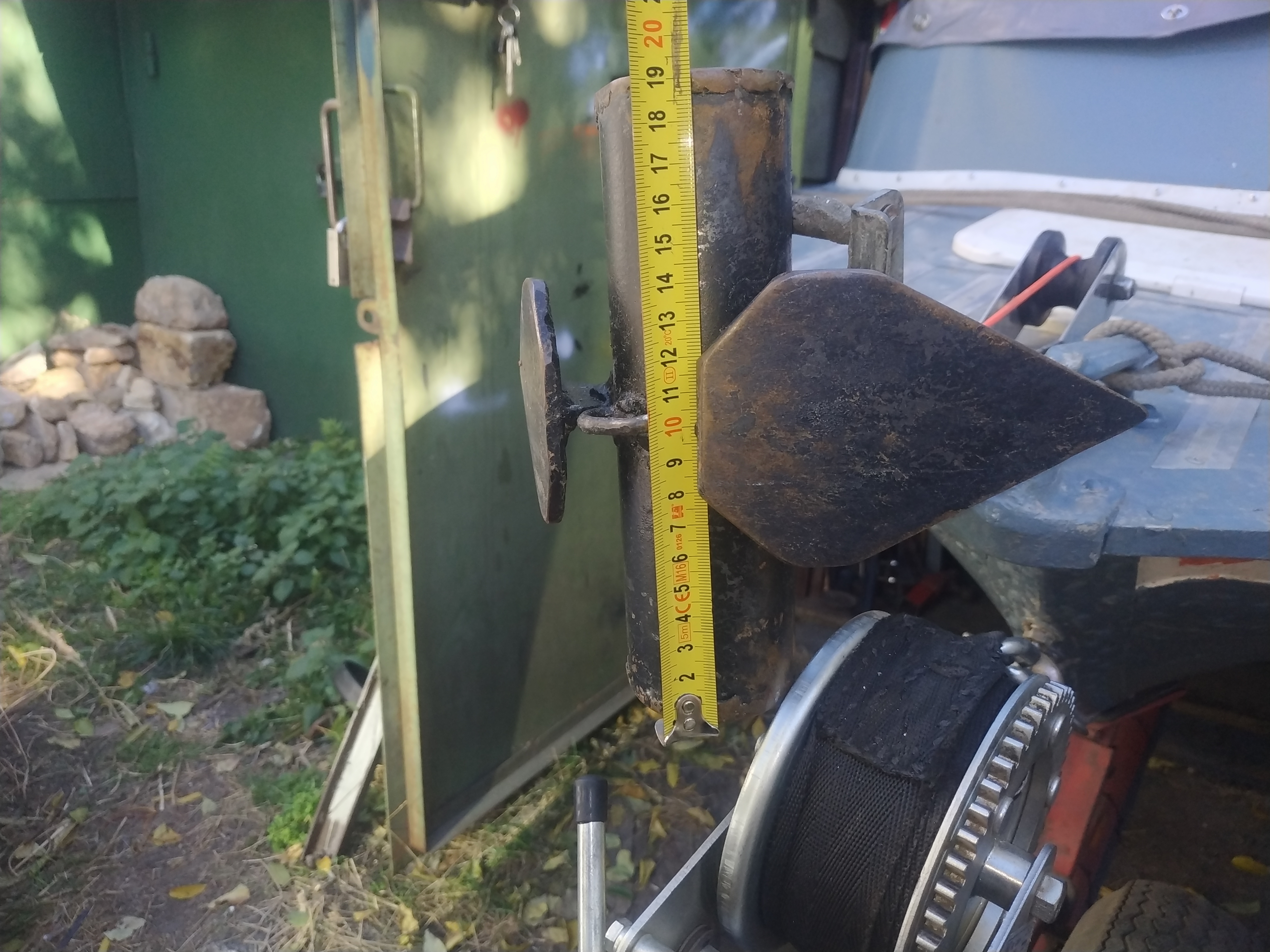 Подобный якорь тут уже выкладывали, но он заслуживает внимания. Самодельный. Держит хорошо, "Зацепная" часть шплинтуется гвоздем и в случае зацепа можно дёрнуть мотором и сорвать шплинт. Хорошо держит даже Амур. Главный минус это большой вес. Сейчас почти не используется. Возможно нужно было делать поменьше