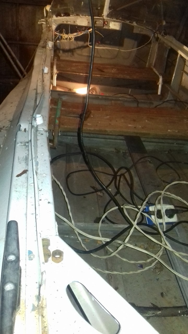 Лодке в неотапливаемой сарайке стоит, но руки чешуться начать восстановление. Замерив расстояние от середины каждого шпангоута (если я конечно это слово правильно понимаю - это штуки к которым крепиться все листы в низу и по бокам) в низу до целого верха борта и до повреждённого, оказалось около двух шпангоутов расхождение 5-6 см., и ближе к корме 1,5см. Первое вижу так - задумка такая: на шпангоуты внизу по середине по всей длине прикручиваю доску, на эту доску в районе шпангоутов устанавливаю домкраты 2-3 штуки под 45 гр. по направлению к верху повреждённого борта, на фото со стрелками попытался изобразить направление от куда и куда буду давить домкратами, и нагревая шпангоуты в месте разрыва паяльной лампой потихоньку выдавливать домкратами, а за тем уже когда всё выравниется в местах разрыва лист алюмишки приклепать.