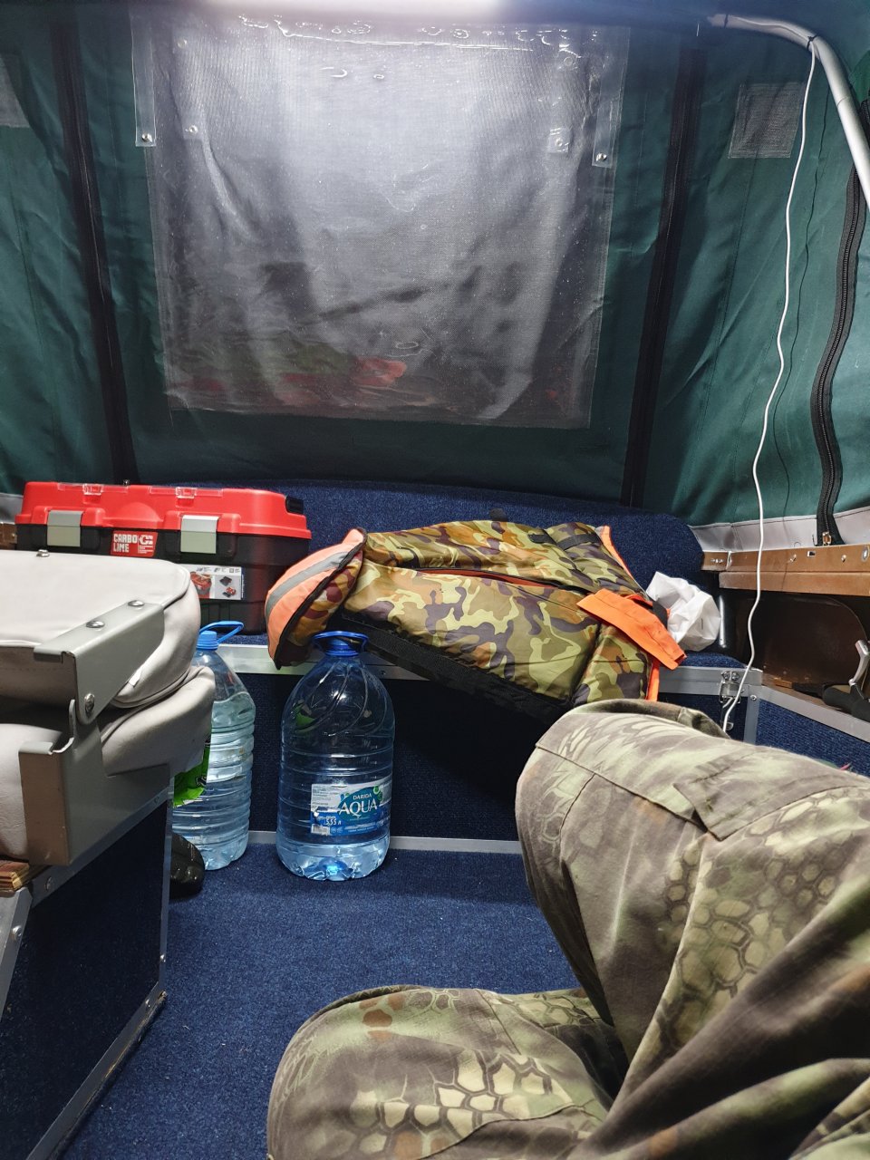 В салоне 19°, дождь, о точнее ливень непрекращается, тент пока нетекет, у Сани в полатке швы днище потекли