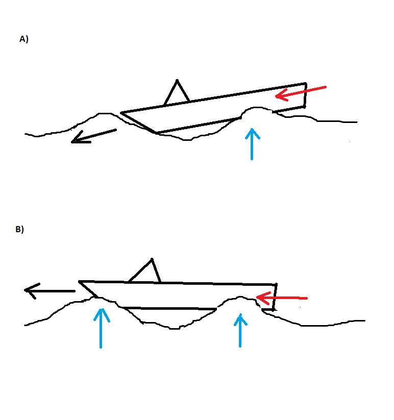 Ну..... Называется это зарывание носа в попутную волну. Объёма в носу тебе не хватает, не хватает водоизмещения.Неее , Андрей когда по волне идешь , и в горб попадаешь, тормаз резкий и бырзги прямо в носу ,аж на палуду, а когда против то всё гуд