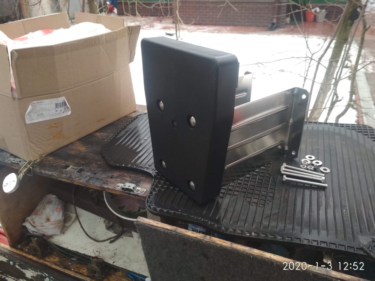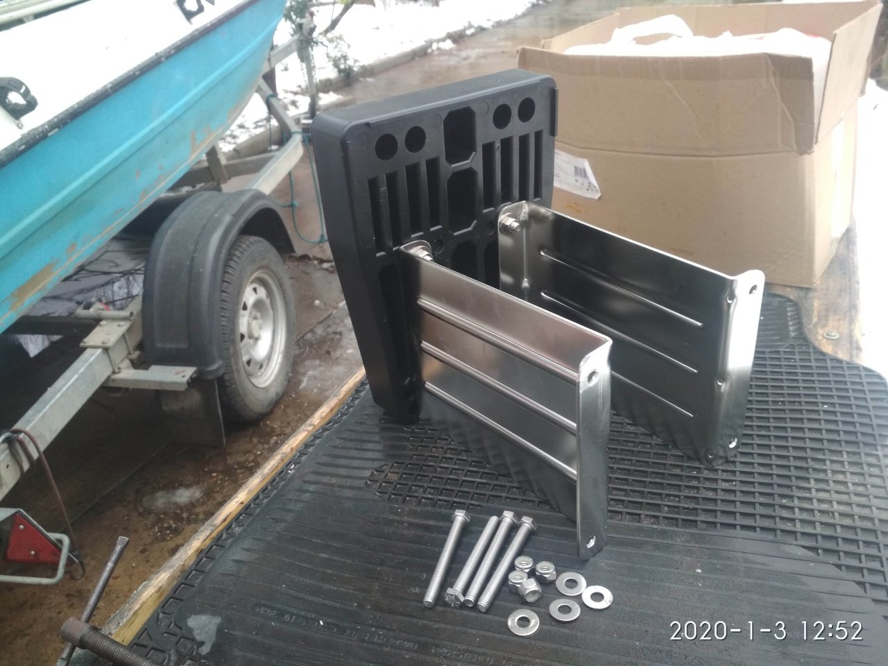 Был без примерки куплен в Воднике на Крым, однако не подошел: без него Джонсон 3,3 висит в углу транца почти без проблем, с транцем - мешает повороту основного мотора. Нержа на боковушках капитальная такая!