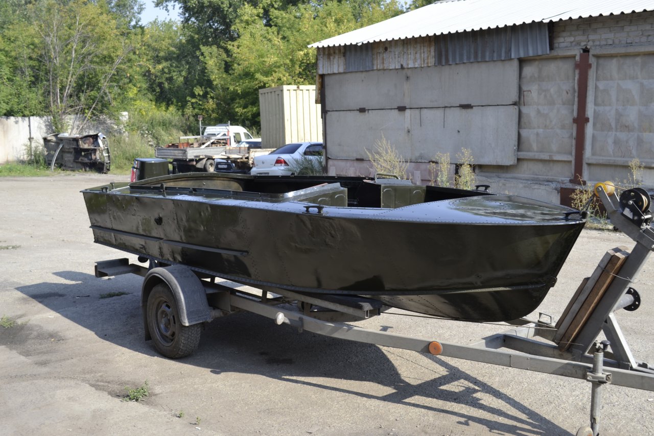 Охотничье-рыболовный вариант цвета тёмного хаки. Корпус лодки в отличном состоянии. Изготовлен ровный пол от носа до кормы и борта из фанеры влагостойкой 9 мм. В носовой части сделано еще одно удобное место для пассажира. Проход через торпеду из основного кокпита в носовую часть лодки. Транец состоит из 2*22мм влагостойкой фанеры во весь борт транца итого толщина транца 44 мм можно повесить мощный мотор. Установлены поддерживающие шпильки 12 мм от транца к усиленой переборке кокпита, которая состоит из листа 22 мм влагостойкой фанеры. Дополнительно изготовлен самоотливной рецесс.