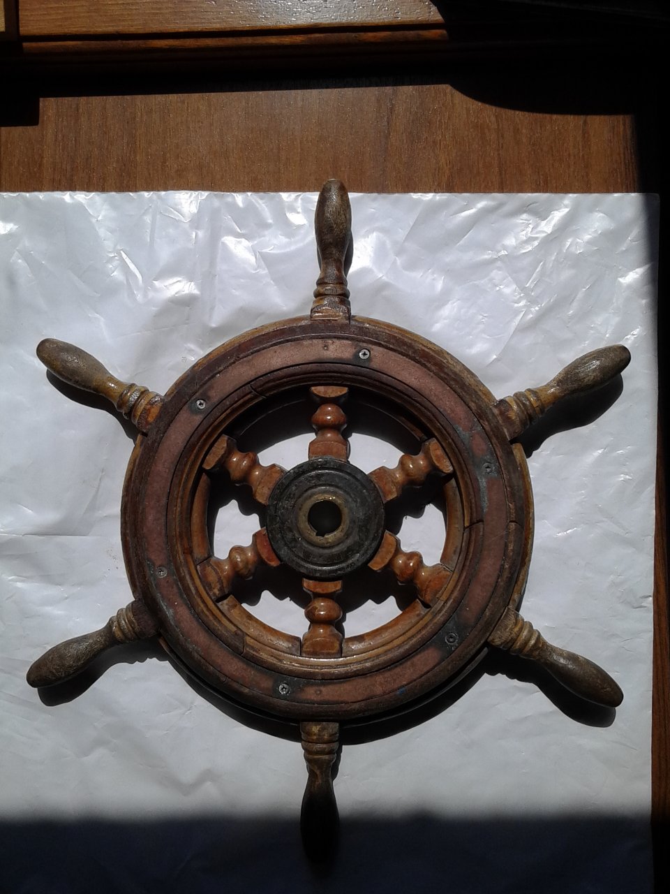 Штурвал для катера. Материал:дерево, медь, латунь. Диаметр внешний по краю ручек 380мм, диаметр под вал 18мм. Необходима чистка меди,латуни, снятие старого лака и нанесения нового. Цена 3500 торг приветствуется.