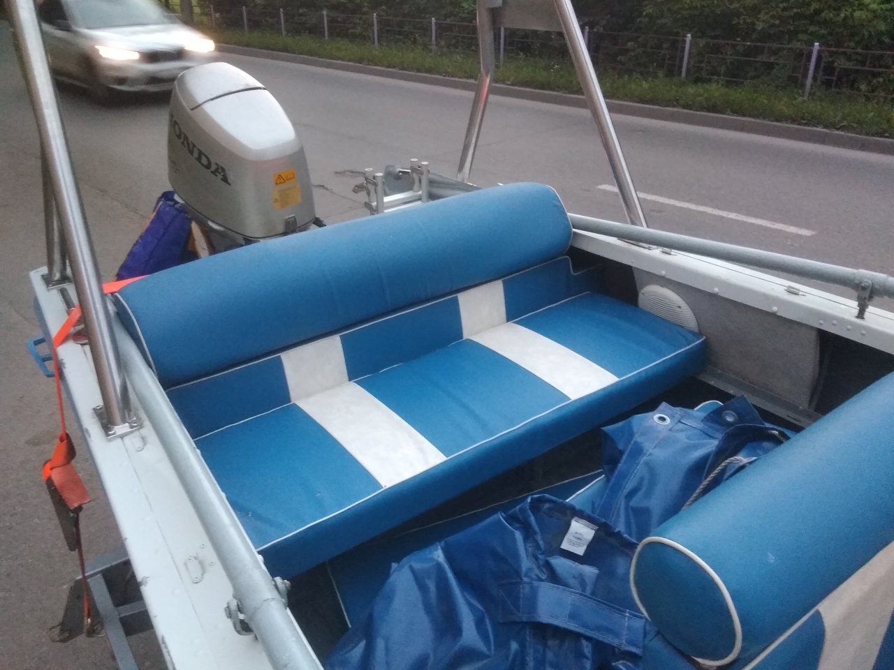 На Казанку пошиты пуфики на кресла и на палубу, есть стояночно-транспортировочный чехол из ПВХ. На мотор тоже есть чехол. В эти выходные еду испытывать новый комплект. Согласитесь, редкое состояние . Говорят, от таких лодок не избавляются. Но я знаю, почему ее продали. Уровень предыдущего владельца выше этой лодки. Он хочет комфортную с каютой и новую. А мне и этой хватит. Есть небольшая необходимость заменить окончания реданов на алюминиевые и не плохо бы заменить киль, а то родной стёрся. Лодка не течет. Мотор я обслужил.