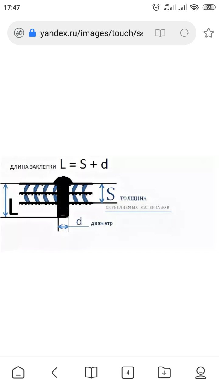 А я делал так: Длина стержня заклепки должна равняться общей толщине склепываемых листов, сложенной с величиной Р, необходимой для образования замыкающей головки; для полукруглой головки Р = 1,5d, конической — 1,3d, полупотайной — 1,1d, потайной — 0,9d.