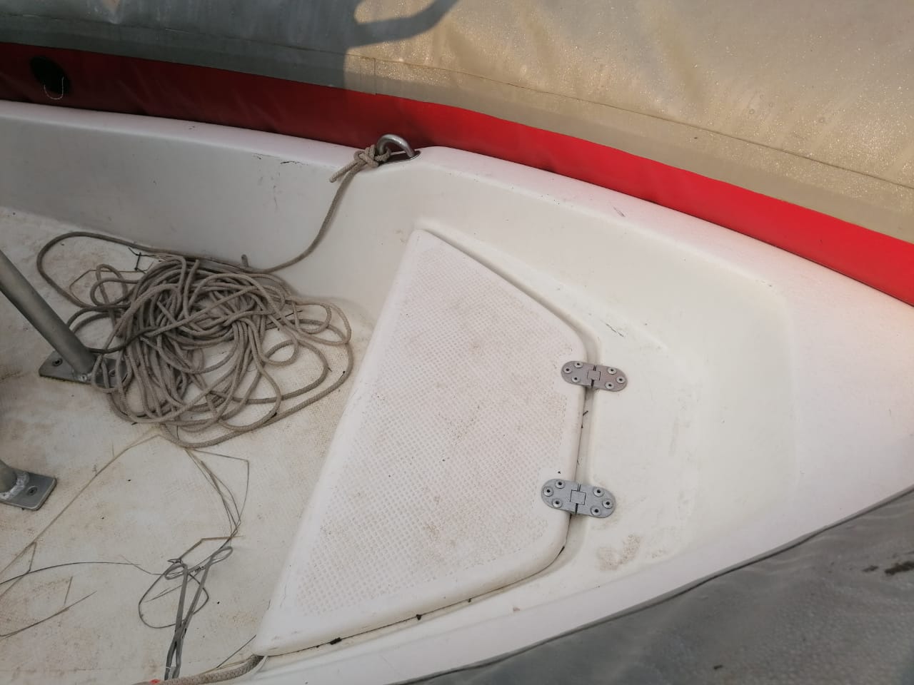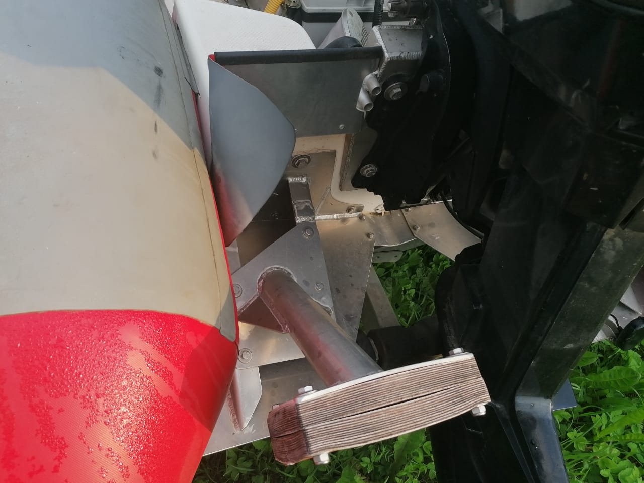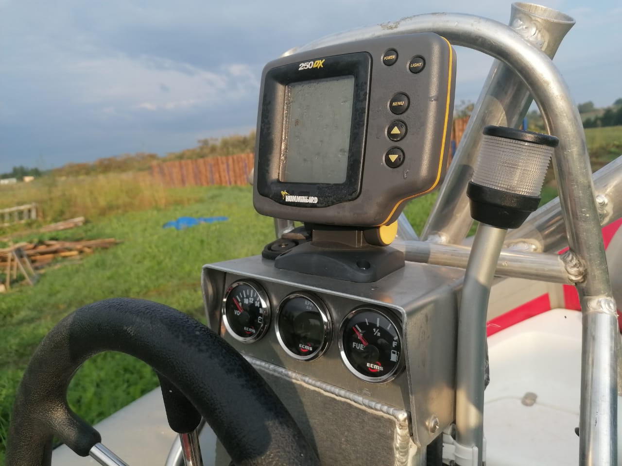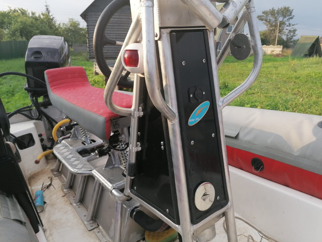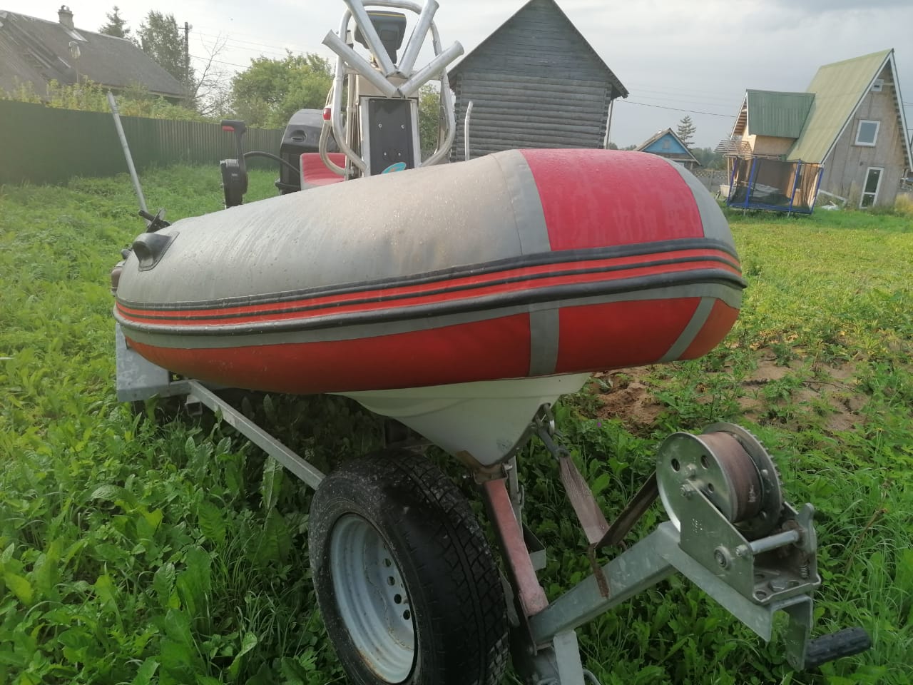 В рибе стоит мотоциклетный пост на амортизационной системе. Встроенный бак, все навигационное освещение, эхолот, тарга на 4 спининга.