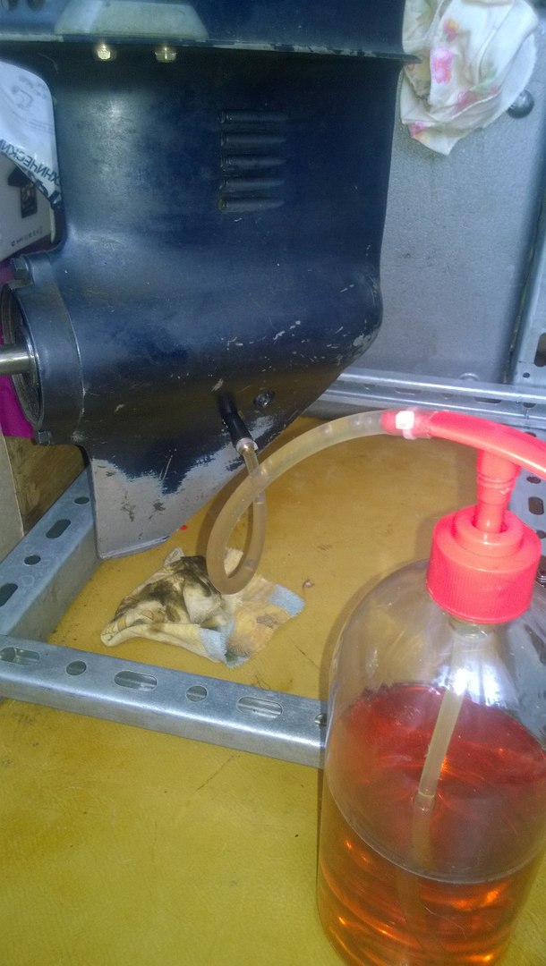 А у меня финская ручная помпочка на поллитровую бутылку. На самом деле устраиваетМожно заморочиться и сделать, а я приспособился в своих моторах таким шприцем менять масло в ноге