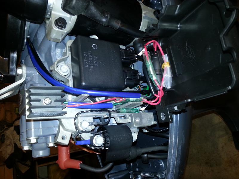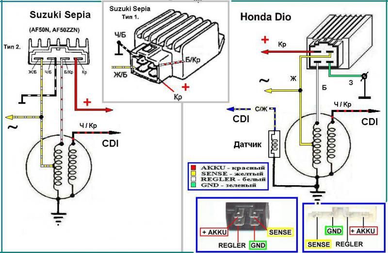 Привет всем! Подскажите как сконектить регулятор от хонды дио и сузуки дт 40. Куда цеплять? Вот фото проводов на выход к потребителям.