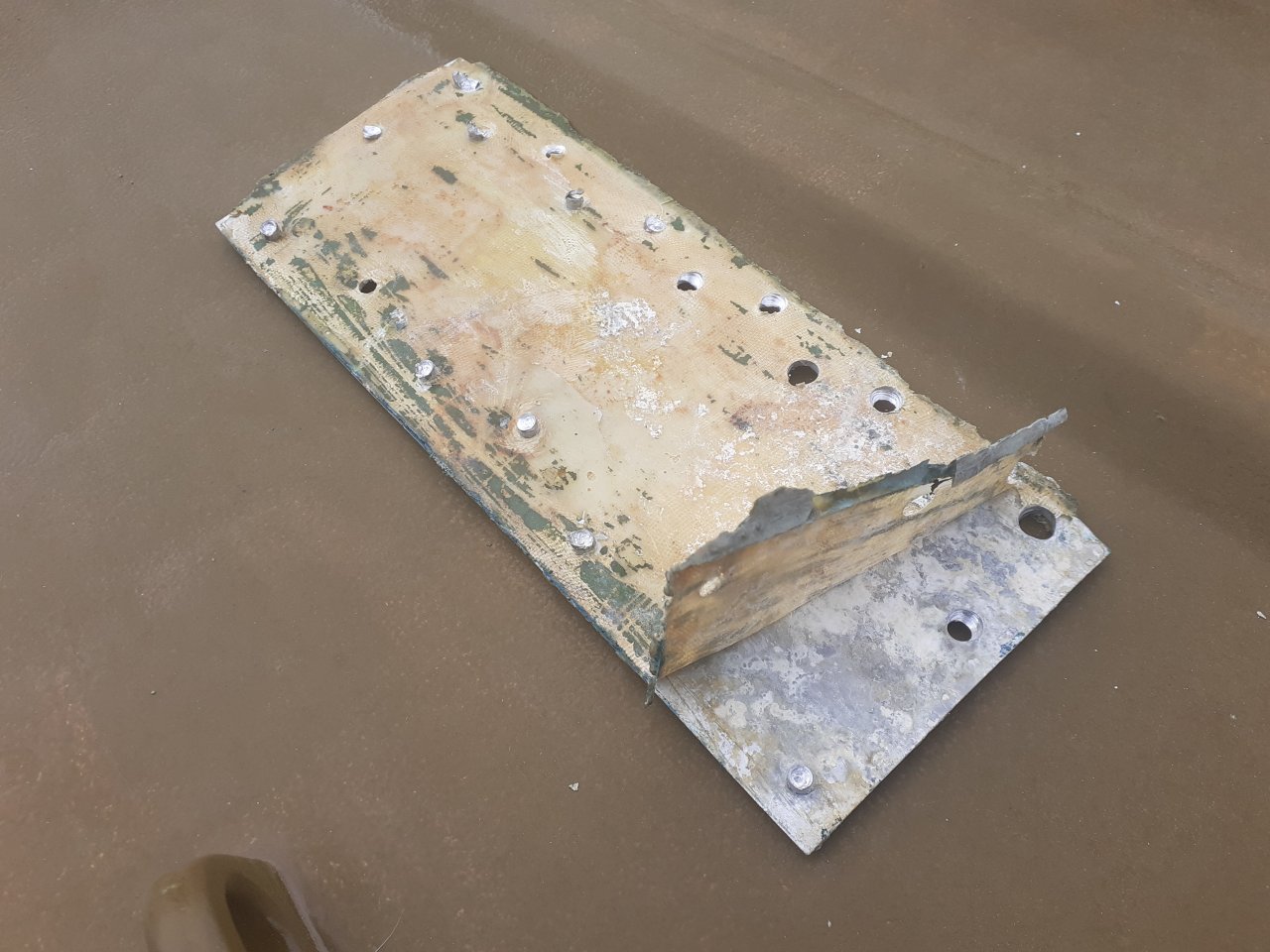 так сказать чувствовал седалищным нервом, что заплатки на днище корпуса надо удалять !На днях прошёл ежегодный ТО на прицеп и сегодня отвёз лодку на сварку днища, предварительно высвверлил заклёпки и снял клёпаные латки - дабы самому понять что ими залепили. Фото чисто для интереса по технологиям ремонта водномоторников того времени (латка, ткань, эпоксидка и заклёпки). Высверливал сверлом большего диаметра чем сами заклёпки, что бы удалить всю грязь в отверстиях металла, т.сказать пытался сэкономить время аргонщику на зачистку (оплата почасовая).