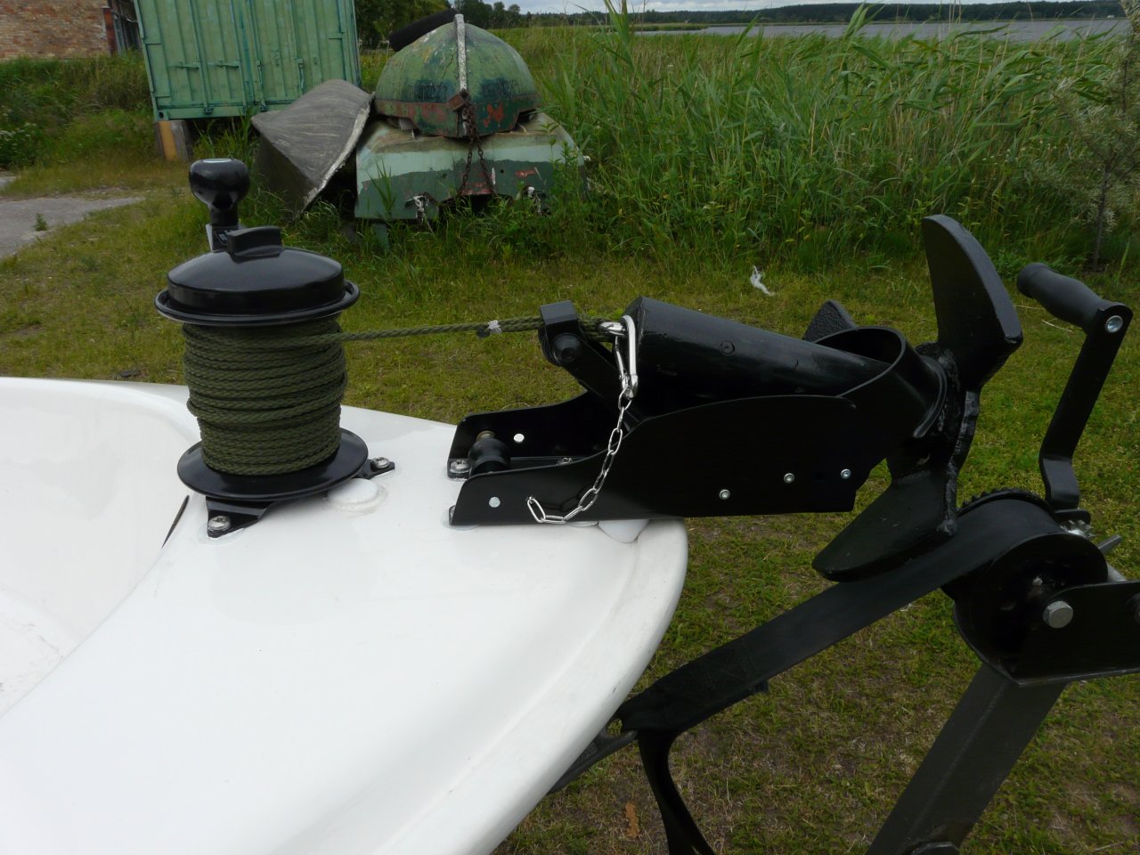 Раньше пользовался ручной лебёдкой "ANCHOR MATE ll" (лодка продана вместе с движком и всем оснащением), впечатления от ручной лебёдки только положительные. Пожалуй якорная лебёдка и саморегулирующиеся транцевые плиты - это те вещи, которые мне шибко нравились в лодке на воде, якорь можно было сбросить моментально или аккуратненько положить на грунт в месте лова рыбы работая механизмом сброса (на фото отмечен зел. стрелкой). Монтировал я его как "шпиль", т.е. вертикально (учитывая конструкцию конкретной лодки).