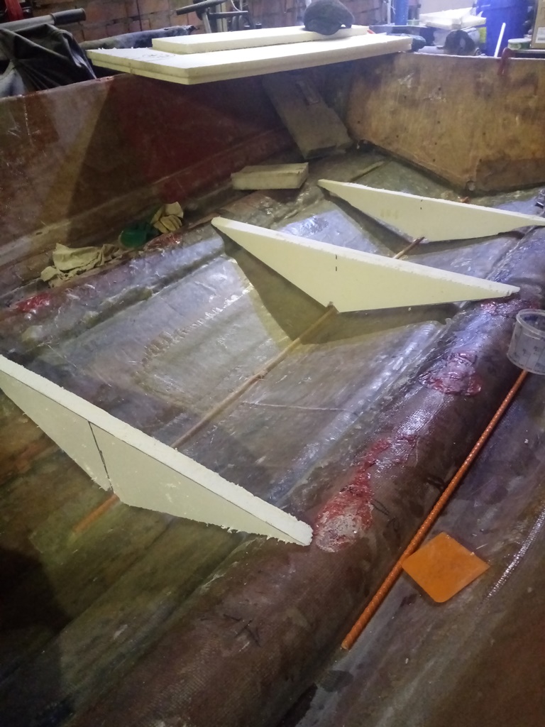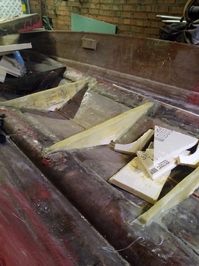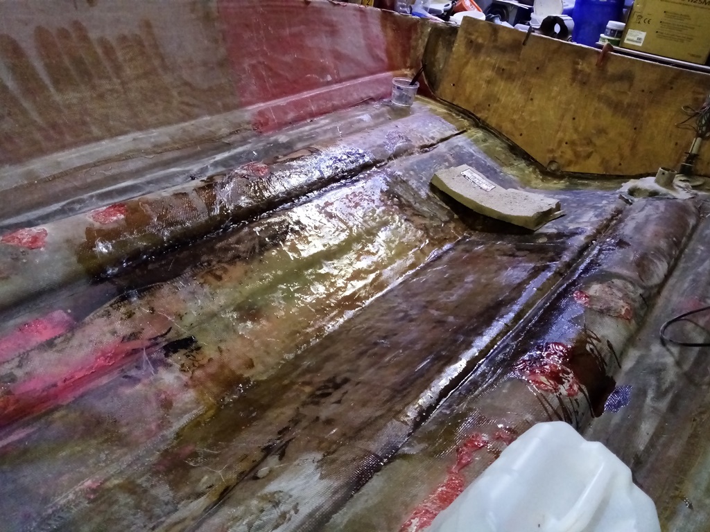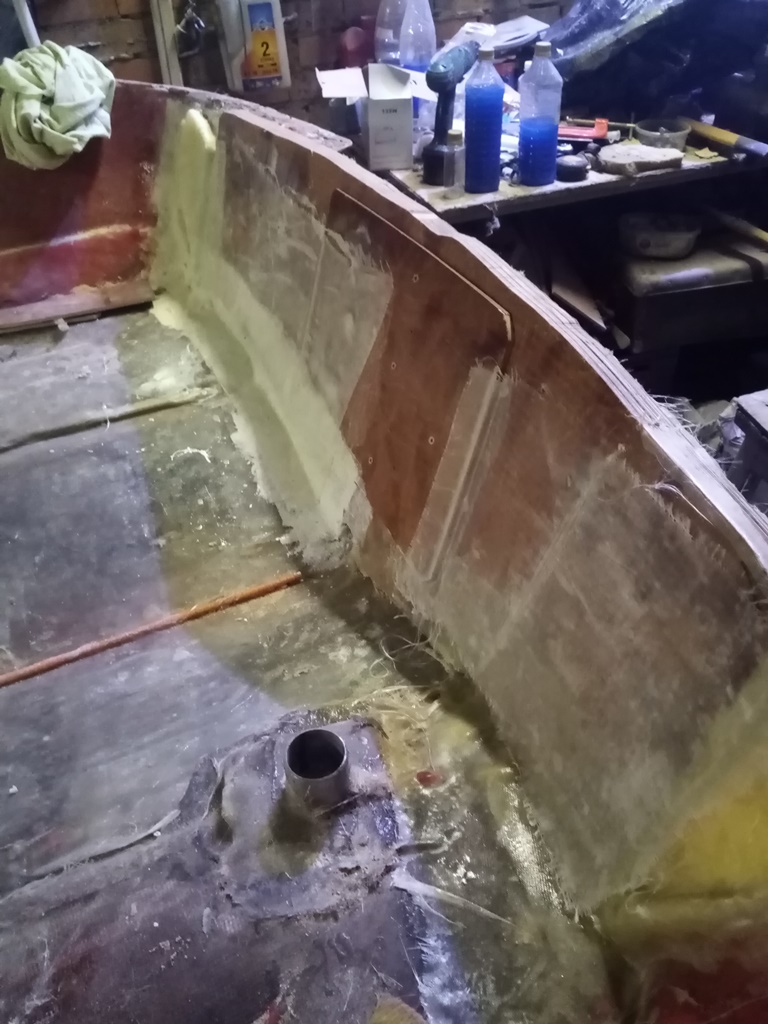 Победил! дно усилил как минимум в 2 раза,все собрал назад,корпуса стянул нержавеющими болтиками на 6мм с шагом примерно 25-30см +стекломат пропитанный полиэфиркой. На всякий случай сделалл 3 шпангоута обрезал злостчастный короб и использую его вновь в качестве опоры для палубы,также под него заложил строительный пенопласт.