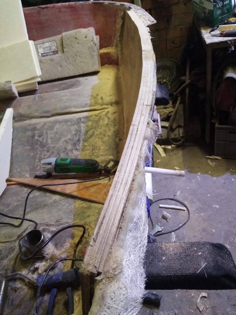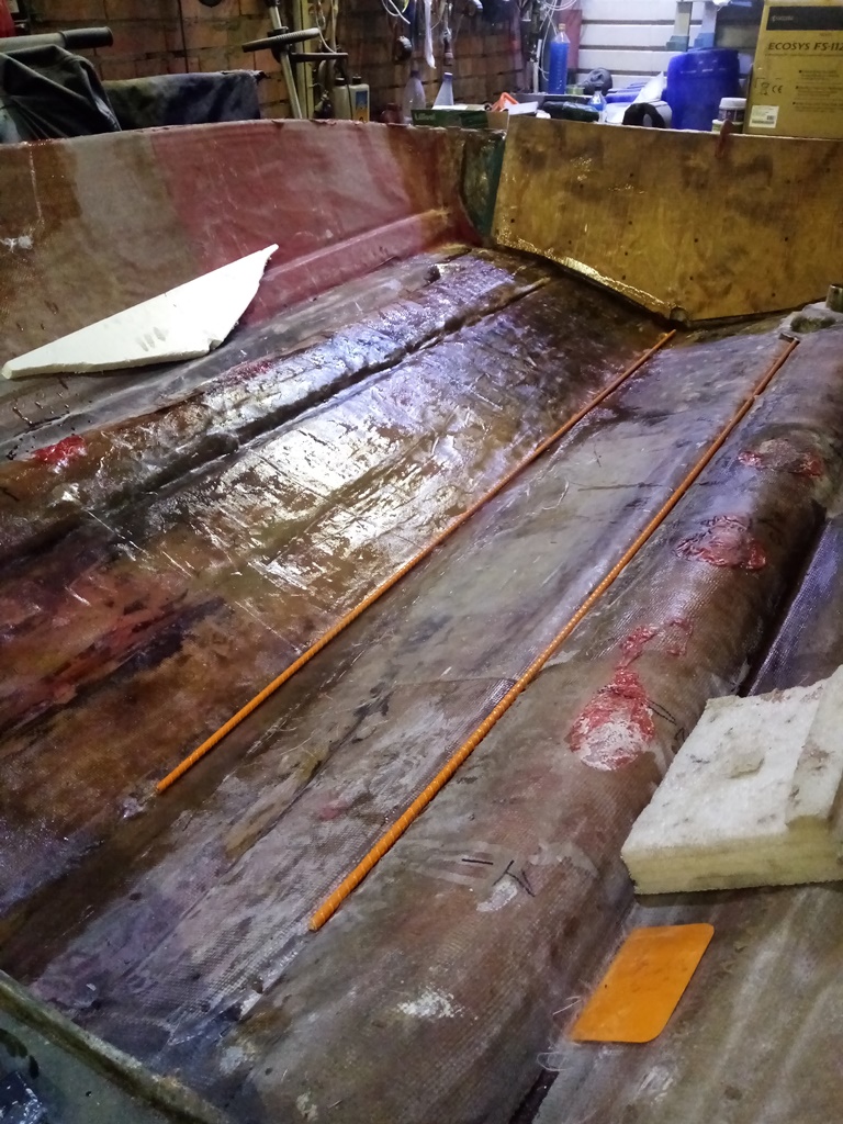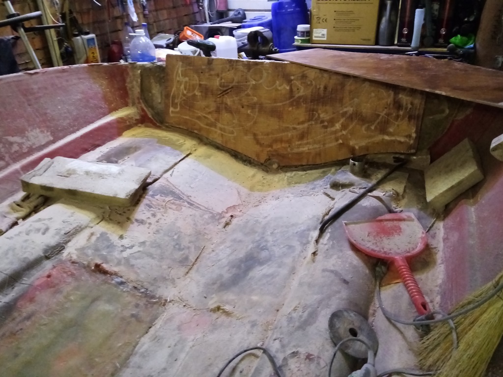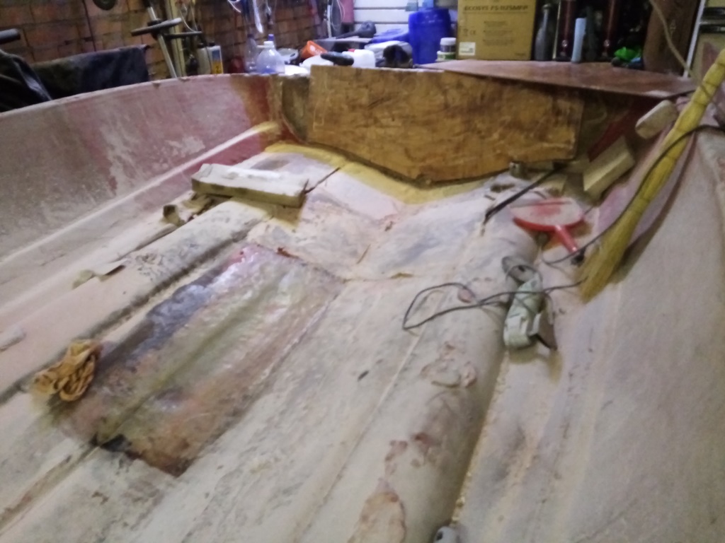 Победил! дно усилил как минимум в 2 раза,все собрал назад,корпуса стянул нержавеющими болтиками на 6мм с шагом примерно 25-30см +стекломат пропитанный полиэфиркой. На всякий случай сделалл 3 шпангоута обрезал злостчастный короб и использую его вновь в качестве опоры для палубы,также под него заложил строительный пенопласт.