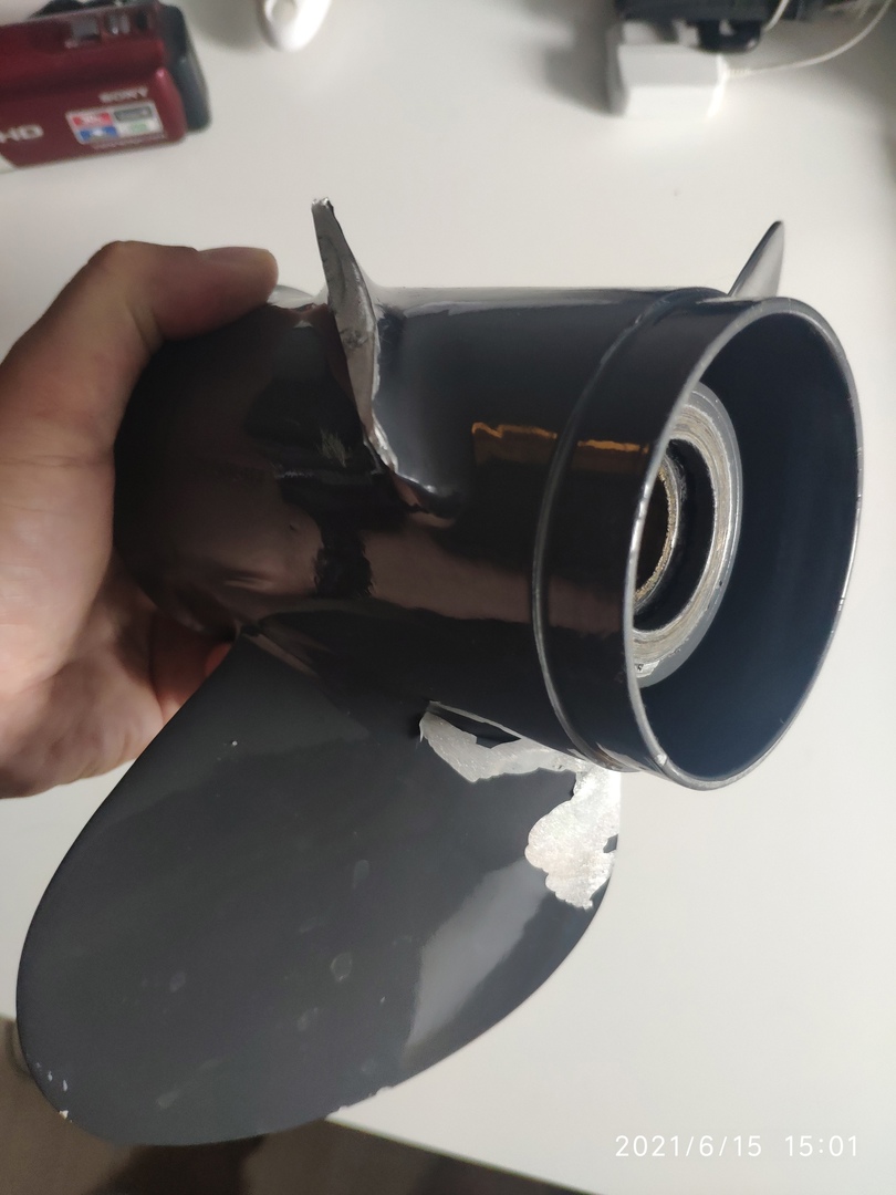 Товарищ Адмирал,винт приехал....на ходу...по ровной воде...без перегрузов,две тушки все штатно,обороты 4800 были.вода стоячая,глубина более 3метров была.щелк...и мотор орет...остановился,поднял...и там вот.нигде не стукал,не чирикал..везде глубоко,от 3-х до 10-ти метров.