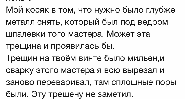 Трещин на твоём винте было мильен,и сварку этого мастера я всю вырезал и заново переваривал, там сплошные поры были. Эту трещену не заметил.
