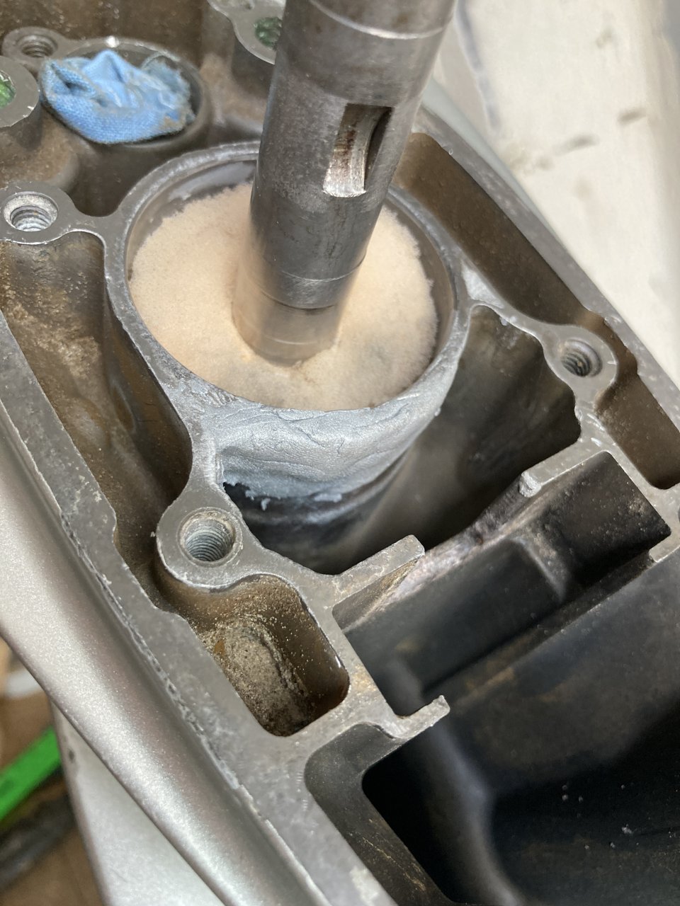 Разобрал редуктор полностью, шестерни и подшипники в отличном состоянии, дыру в корпусе полставки помпы заклеил холодной сваркой по алюминию weicon (ждал три недели) получилось неплохо. Вал торсионный не снимал. Диаметр отверстия под полставку помпы 45 мм+, нашёл трубу 45 и использовал в качестве оправки. Заодно замазал пару каверз. Долго, нудно, неудобно, но на ощупь получилось не плохо. Обойма гребного вала вытащилась хорошо, но стояла на герметике. На корпусе редуктора присутствуют не большие окислы. Отчистил, полирнул, резиновые кольца новые, сальники естественно тоже-оригинал. Так как окружность посадочного места проставки помпы полировал вручную, сегментом 45 трубы. решил не рисковать и поставил на серый герметик. После сборки опресовал давлением 1атм. При переключении скоростей давление не падает (полировал шток), но увы, медленно но верно давление все таки падает(…минут за 10-15 до «0»…завтра окуну в бочку, посмотрю -что пропускает…сегодня уже сил не было(…лень).