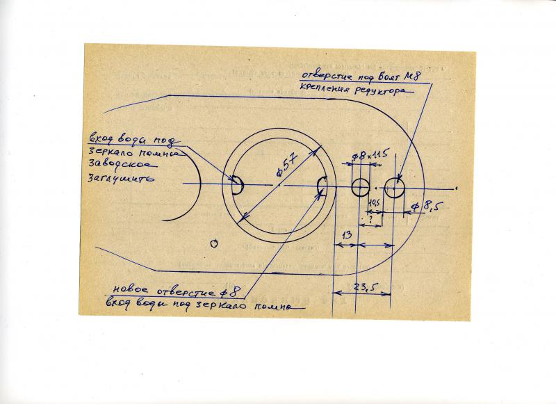 Я на своем очень старом таком редукторе сверху между отверстием под крепежный болт и посадочным местом под установку помпы просверлил вертикальное отверстием д.8мм. Внизу просверлил сверлом д.3мм несколько отверстий для забора встречного потока воды (как на новейшем редукторе). Со стороны полости под зеркалом помпы просверлил отверстие под углом, соединив его с новым вертикальным отверстием. Поставил две заглушки: одна сверху на новое вертикальное отверстие, вторая на заводской выход воды в полость под помпой. Нержавеющую трубку не ставил, так как это был экспериментальный вариант. Все работало нормально. Для нормальной эксплуатации в целях долговечности, конечно, надо отверстие рассверливать до д.10мм и вставить тонкостенную трубку д.10х1 уплотнив водостойким клеем. Вертикальное отверстие необходимо сверлить только после тщательной установки, так ка можно запросто влезть сверлом в полость редуктора.nika_08 сказал(а):на выхлопном патрубке