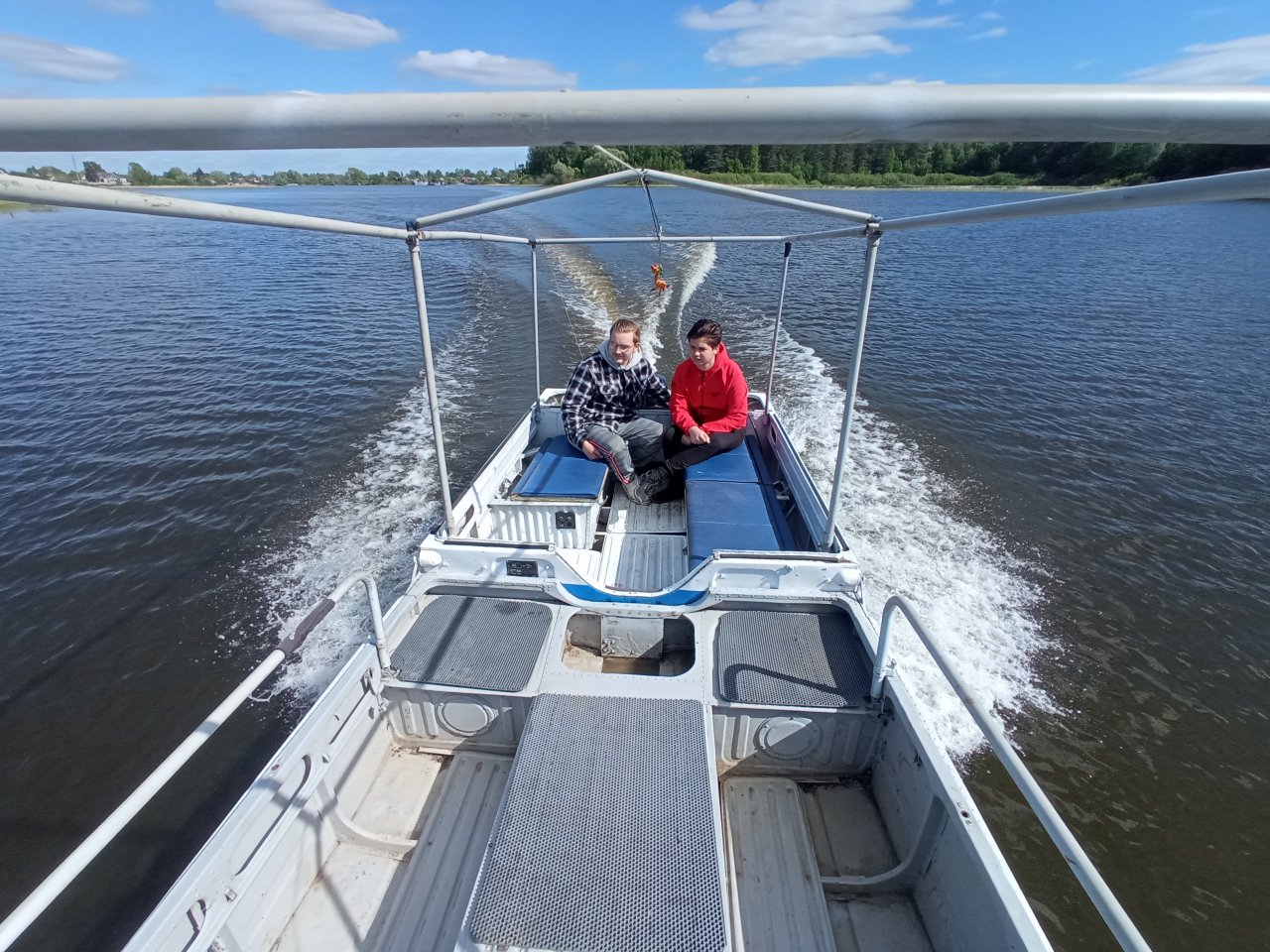 Завелась в нашем флоте лодочка, да не простая. Собрана по авиационным технологиям, из очень лёгкого алюминия, со множеством силовых элементов. Ни дать не взять, не корпус, а фюзеляж вертолёта. Да и размещение пассажиров не типовое, сиденья вдоль бортов, откидные рундуки. Состоит из 2х половин. Первая половина - основание ездовое, с колёсами и подвеской от мотоцикла Урал, вторая часть подвесная, она же крышка, при транспортировке по дорогам.