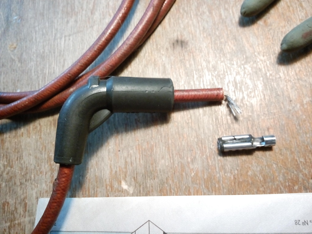 Ага, у меня колпачки другой системы)) Тупо потянув сильно за железку, провод вытянулся (идёт очень туго, немазаный сухой). ОТкусив железку, намазав колпачок и другой провод - заходит как по маслу. Осталось насадить контакт и задвинуть провод назад.