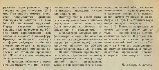 Здравствуйте!!! Мужики помогите оживить сдохший салют!!! Нет искры на контактном зажигании, при прокручивании прибор показывает на высоковольтном проводе отклонение стрелки до 60 V, Электронное зажигание не интересует. Хочу восстановить контактное оно проще.. Посоветуйте, что можно сделать? В чём причина? (что перемотать, намотать, поменять, что от чего подходит? мотор 70 года, почти новый!