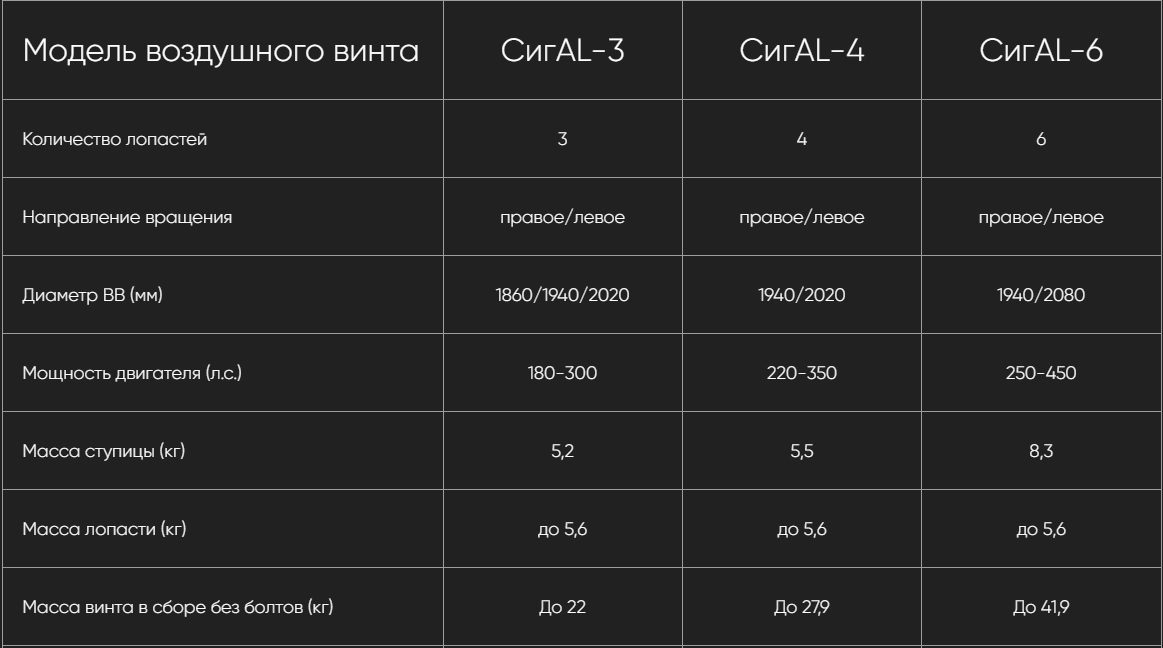 - Воздушные винты СигAL не требуют балансировки. Так как изготавливаются на высокоточном ЧПУ оборудовании. Вес каждой лопасти точен грамм в грамм, что позволяет менять их местами в ступице без выполнения балансировки.