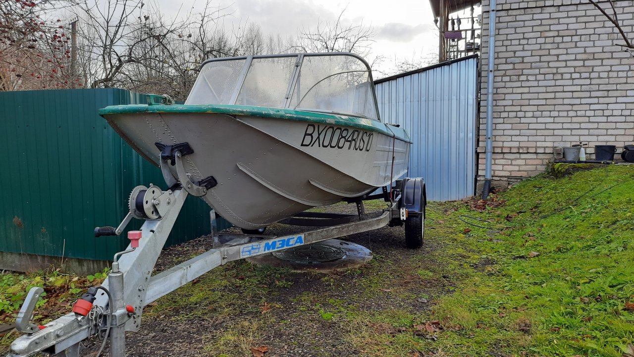 И вот свершилось,лодку я забрал,точнее комплект-лодка,мотор(Я-25) и прицеп(МЗСА D). Лодка без хирургических вмешательств,все в стоке. Заменено лишь рамка со стеклом. На мой неискушенный взгляд,лодочка для своих лет выглядет на 5-