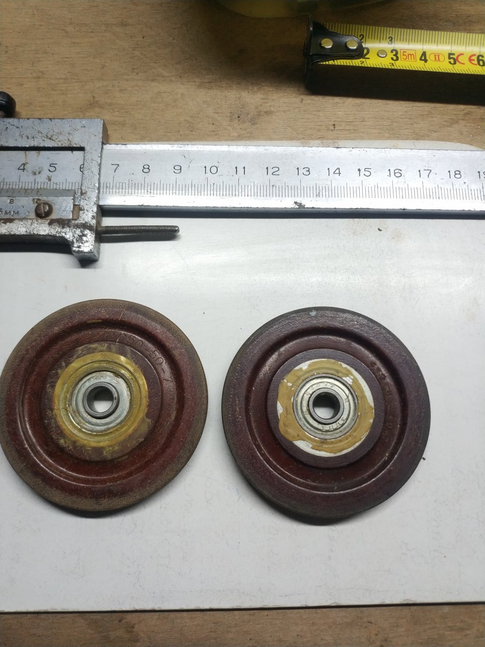 Вот такие ролики диаметр наружный 60 мм, по канавке для тросса 50, толщина 7, диаметр внутренний оси 7, толщина втулки подшипника 8