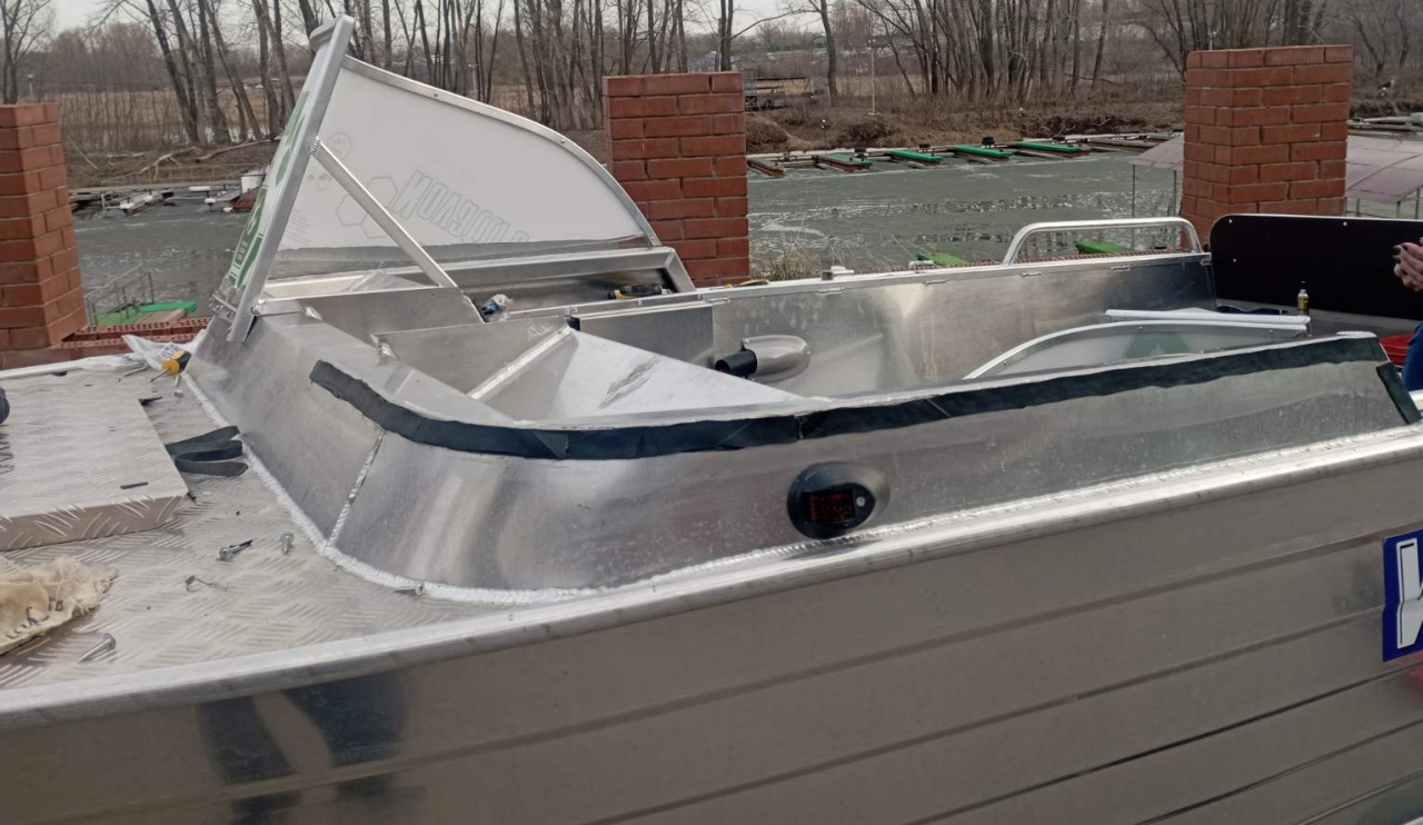 Всем доброй вечерней субботы! Небольшой рассказ на тему, "как я провел субботу". Произвел капитальную установку стокового стекла, будущим покупателям возможно пригодится, сначала установил на штатные оцинкованные саморезы, проверил все, присутствуют небольшие отклонения "от нормы, в пределах 0.5-1.0 см", сойдет для сельской местности, снял все, далее, готовим прокладку - я взял обычную автомобильную камеру, вырезал полосы 2 см шириной, все обезжириваем и наклеиваем на корпус лодки под стекло, по переду в 3 слоя, ибо щель на полпальца, иначе не притягивается (возможно все сделано для проветривания