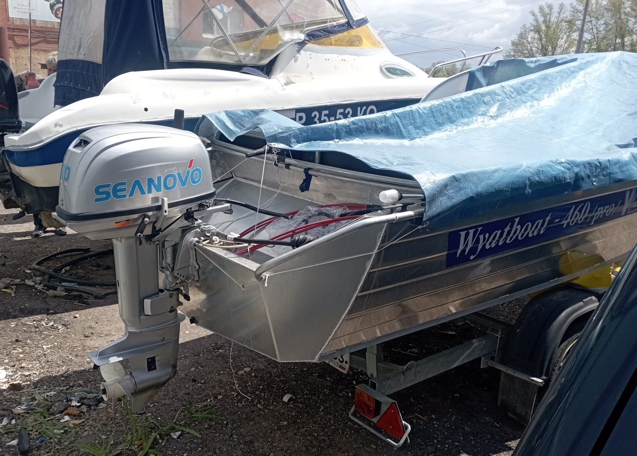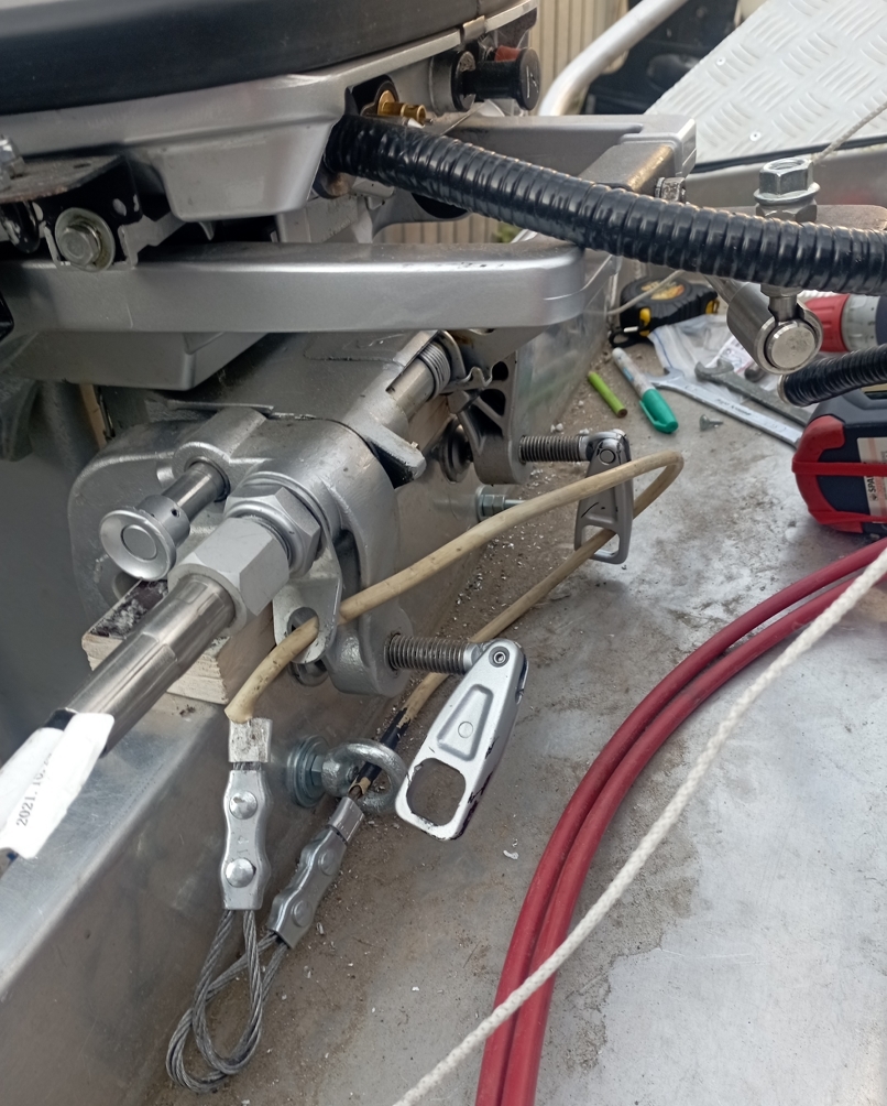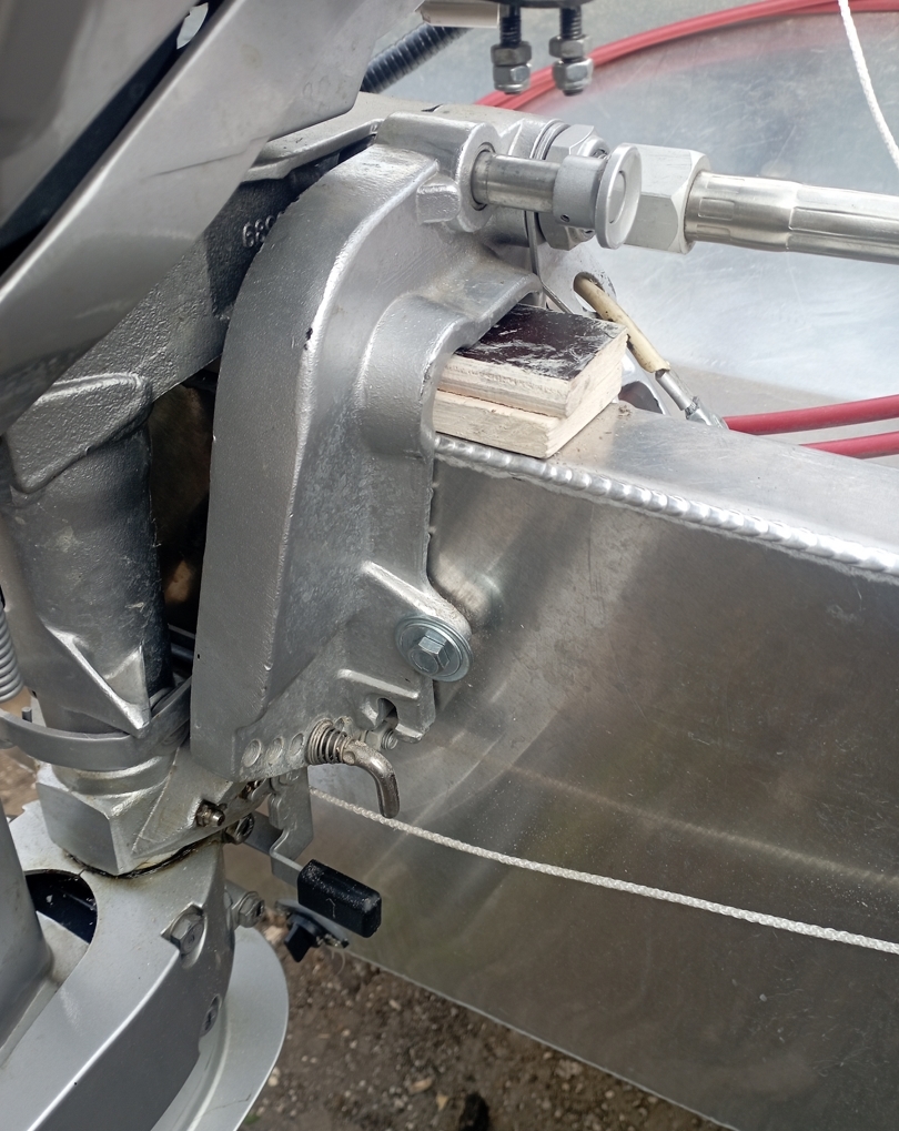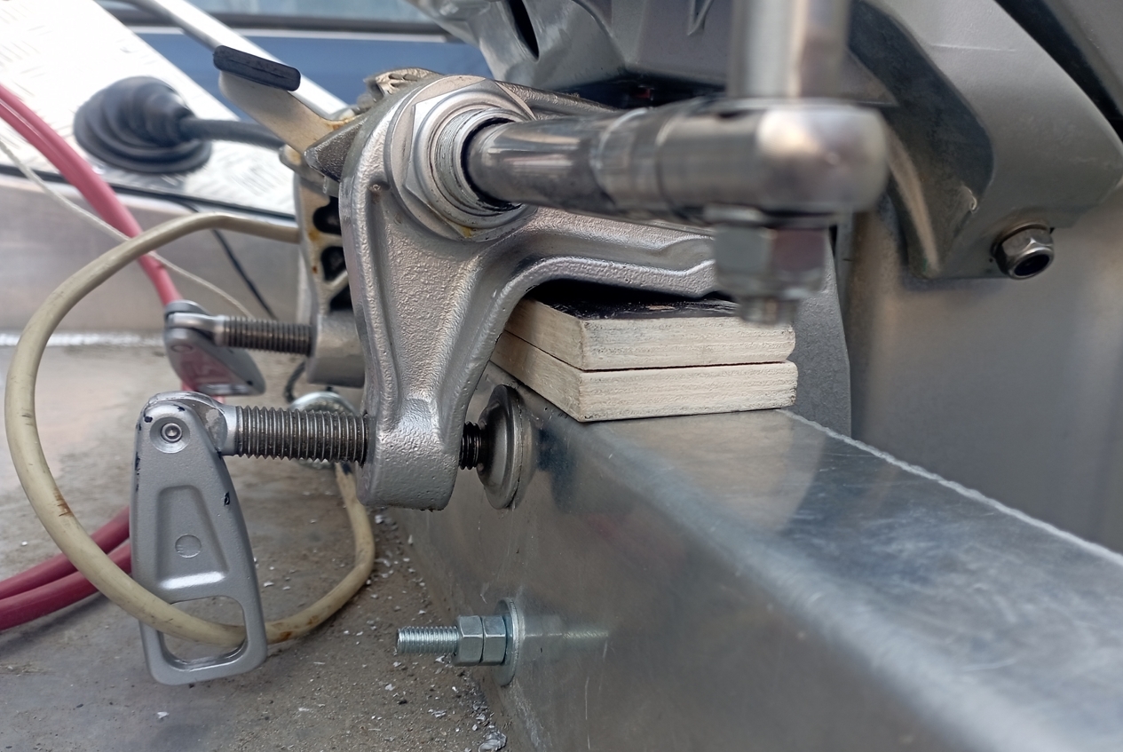 Болты лучше купить в автомагазине, усиленные, с мелкой резьбой и самоконтрящимися гайками.Всем привет! Сегодня отцентровал и закрепил двигатель. Как-то струбцина странно по верху транца располагается, транец со скосом по горизонту не в нужную сторону, задняя часть струбцины прилегает полностью, я нифига не понимаю, может так все должно быть. Уровень АКП - на 1 см ниже днища и на 1 см выше уровня киля. Два болта 100х8, плюс рым-гайка для страховки двигателя тросом. Думаю вот, есть смысл еще пару болтов поставить - они ниже транца получаются, но так же через транцевую доску... Уважаемые коллеги, что скажете?