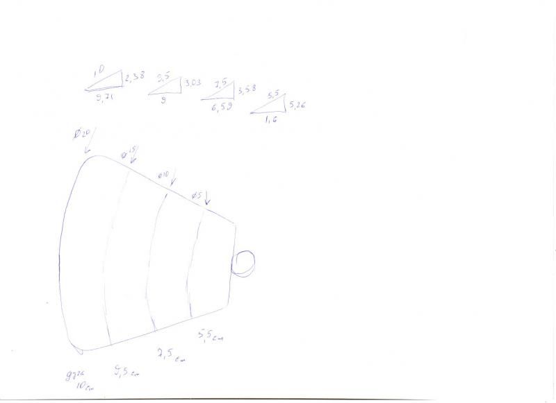 Есть всегда как минимум два способа что-то сделать, кошерный и не кошерный. Результат у них одинаковый. Я посчитал горку исходя из размеров лопасти через теорему пифагора, Калашников считает для сектора 36 градусов, gosha83 через тангенс, вы лопасть подогнали под угол. Все это одно и то же. Только как узкую часть потом приварить чтоб не оторвалась? С широкой проще это реализовать.Telenkov сказал(а):пока начну без формул.Допустим тебе нужен 4х лопастной винт с шагом 300мм.(пройденное расстояние за один оборот) так как лопасти 4 делим 300мм на 4, получается высота уголков 75мм (эта высота не меняется на всех уголках, если увас шаг постоянный) Теперь берется радиус винта и высчитывается длинна окружности (в инете есть калькулятор, забиваешь радиус получаешь длину окружности) Так как лопасти у нас 4 то делим длинну окружности на 4, получаем длинну нижней части треугольника, ну а по диагонали линию просто проводим. получился треугольник с нужным шагом. вертикальный размер-шаг всегда одинаковый, Так надо посчитать каждый радиус (каждую канавку сколько их на диске) У тебя получатся треугольники длинные с наружи и плавно уменьшающиеся в длинне ближе к ступице, но высота у всех будет одинаковая. Старался очень просто все написать. если надо нарисовать нарисую.