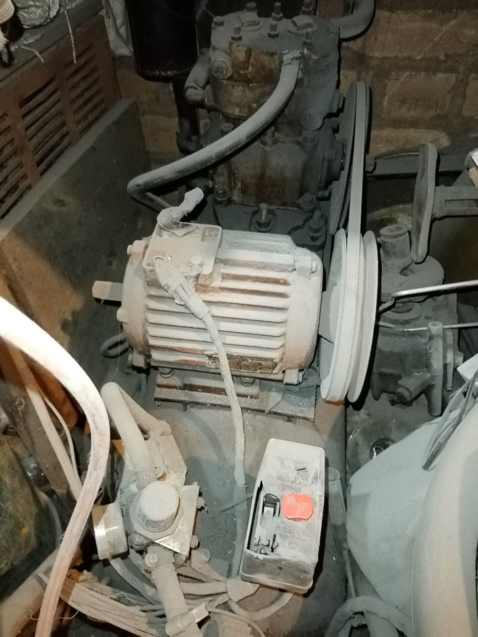 З мя фазами 1,1кВт 1500об/мин, ресивер из 50л. пропанового балона. как видно по фото передача прямая и по пылище тоже видно, что годами его не обслуживают ваще ни как. Запросто тянет плазму ну и пульки там всякие, опресовки, пескоструй не пробовал, думаю кисло будет, ибо объем нужен для песка.