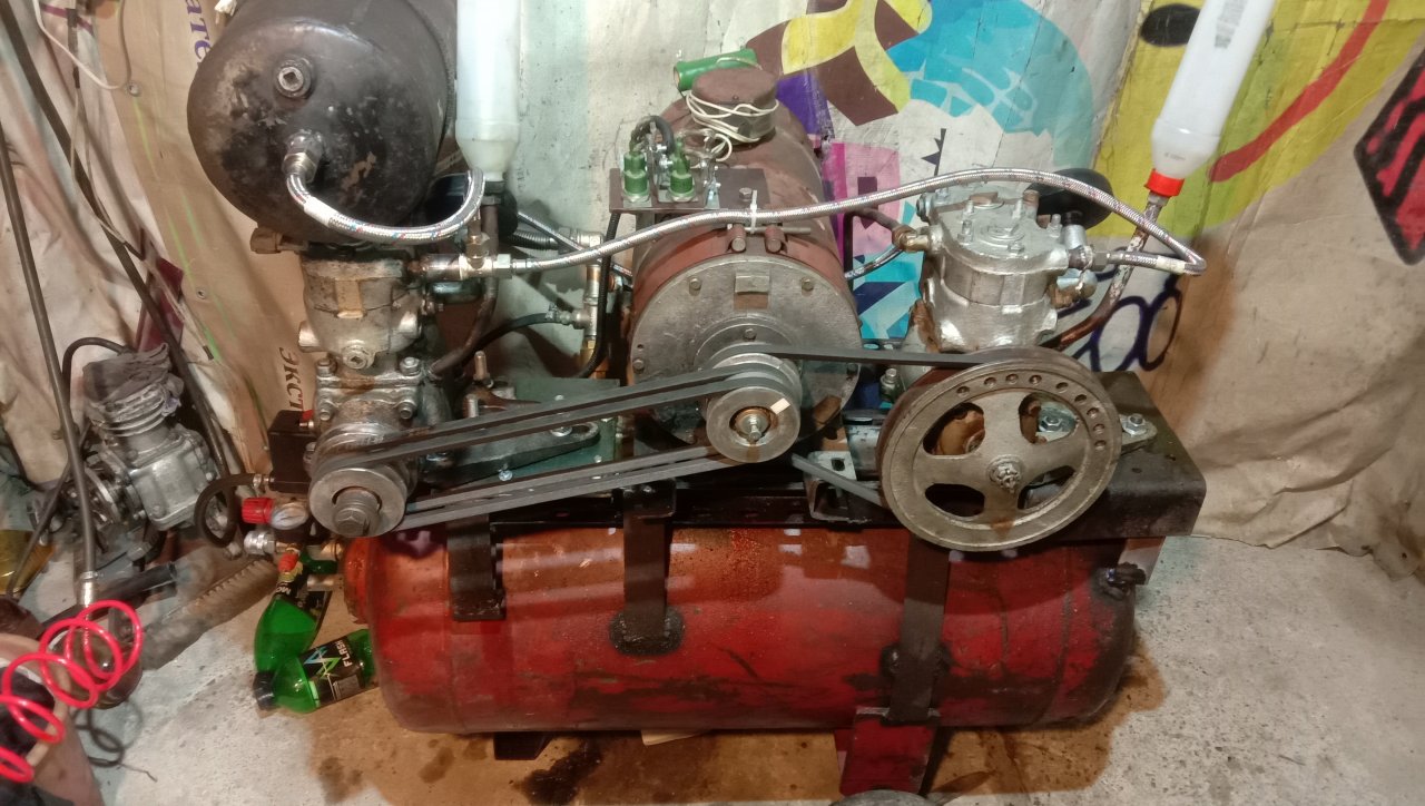 Сейчас пользовался, за одно еще раз проверил. Подобрал резистор в цепь возбуждения. Замерил напряжение на диодном мосту во время работы. Просадка до 160 вольт, т.е. Реальная мощность 1.163 кВт. Частота вращения двигателя 1300 в начале и 1260 в конце. Накачивает от 5 до 7 атмосфер за 54 сек. Т.е реальная производительность агрегата при таком напряжении 220 л/мин. Проверил какое давление держится при работе пескоструя в постоянном режиме с одновременной подкачкой. Сейчас останавливается примерно на 5.5 атмосфер, а вот продувочный пистолет имеет меньший расход. Стравливал воздух с ресивера, чтобы сработала автоматика, но пистолет не отключал после включения - давление очень медленно, но поднималось.